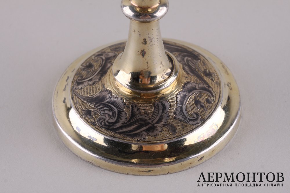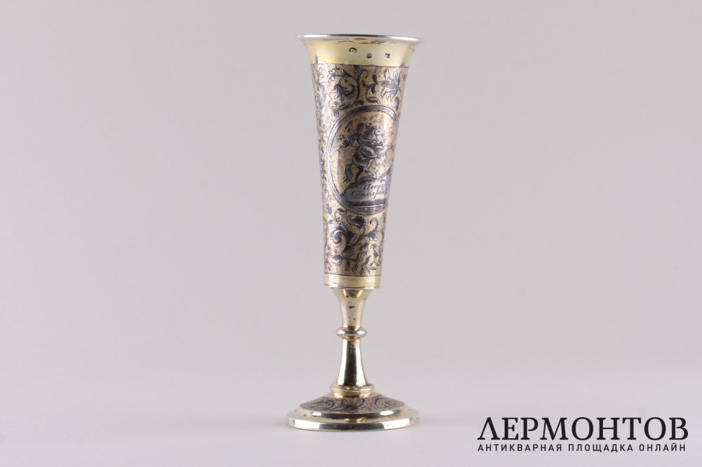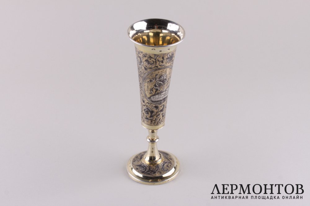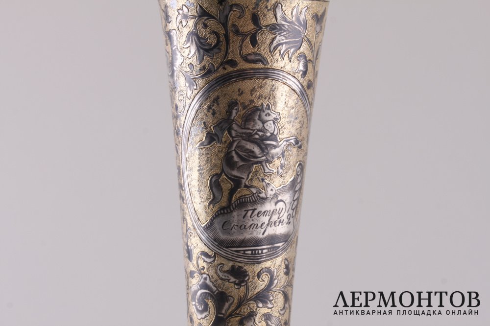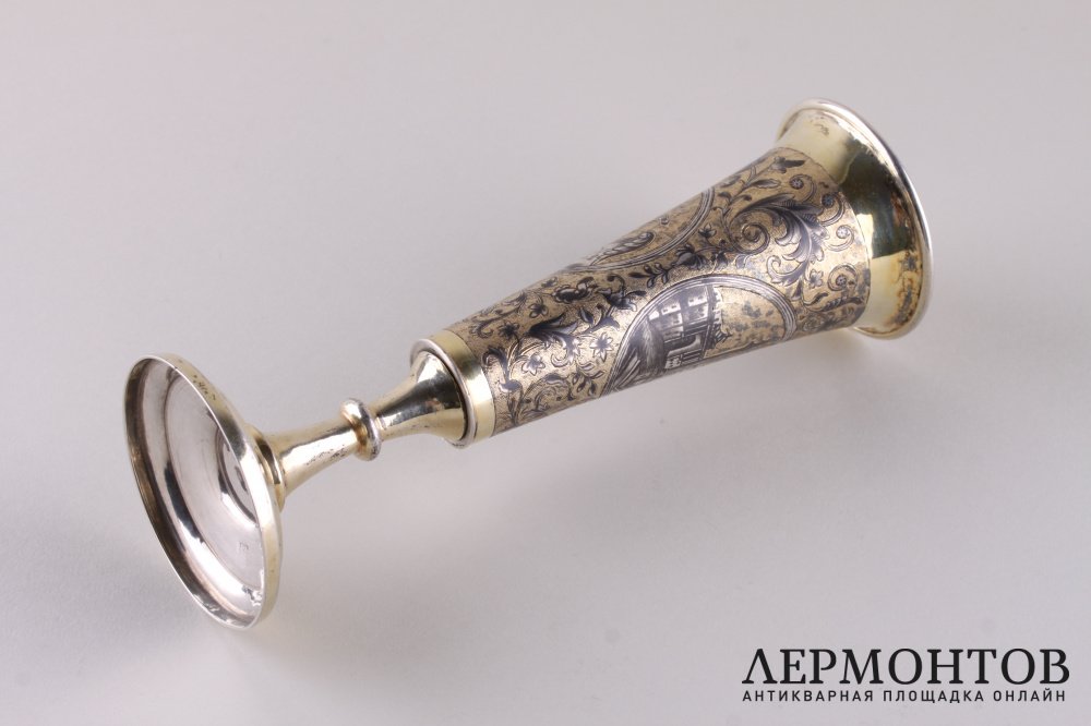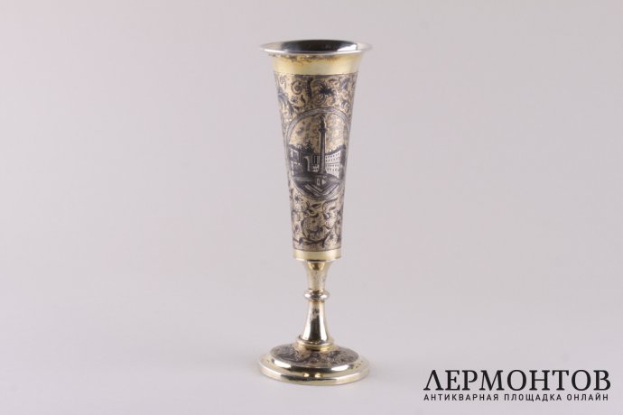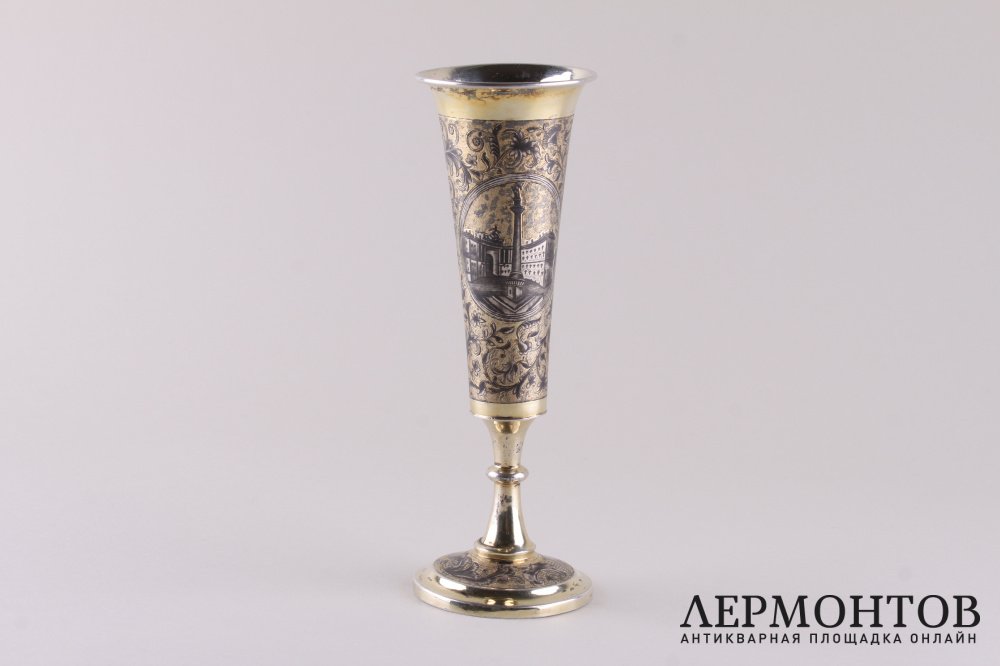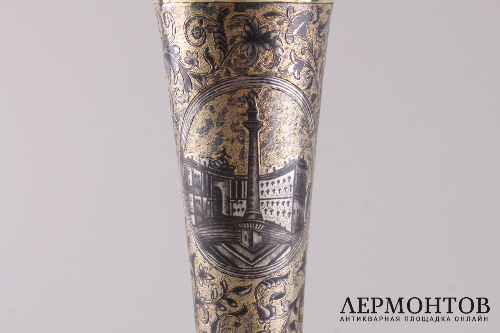 Редкий бокал для шампанского из серебра 84 пробы, изготовленный в Москве в 1840-е годы. Украшен черневым узором с изображением известных достопримечательностей Санкт-Петербурга: Александровской колонны с одной стороны и памятника Петру I c другой.
