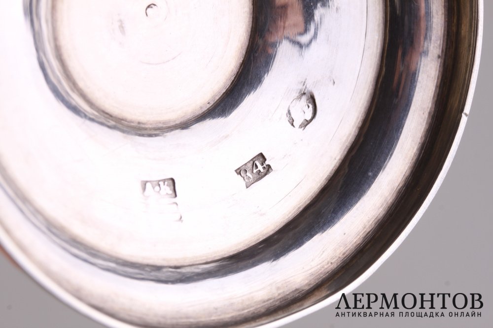 Обращаем ваше внимание на то, что изделие выполнено из серебра 84 пробы, о чем свидетельствуют клейма и экспертная оценка. Клейма: пробирное клеймо Москвы - "Всадник с копьем"; цифровое обозначение пробы "84"; инициалы пробирного инспектора Ковальского Андрея Антоновича (1821-1856гг. - П.-Л. 2108-2109).