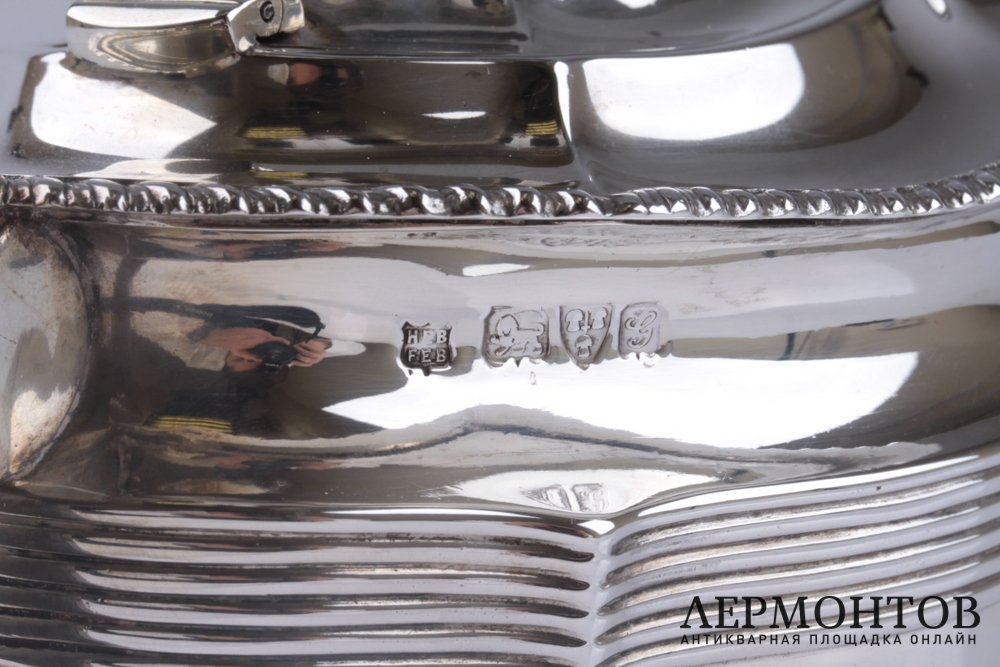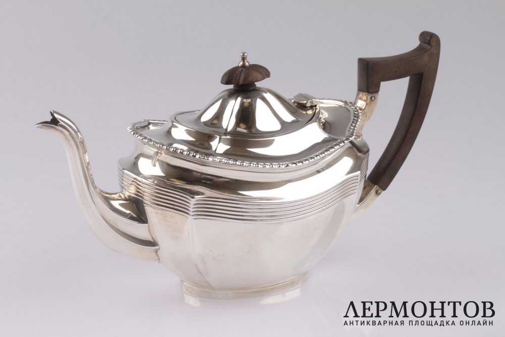 Классический английский чайник, изготовленный из серебра 925 пробы в Англии. В верхней части тулова украшен по периметру рельефным орнаментом. Ручки выполнены из дерева. Чайник сохранен в отличном состоянии!