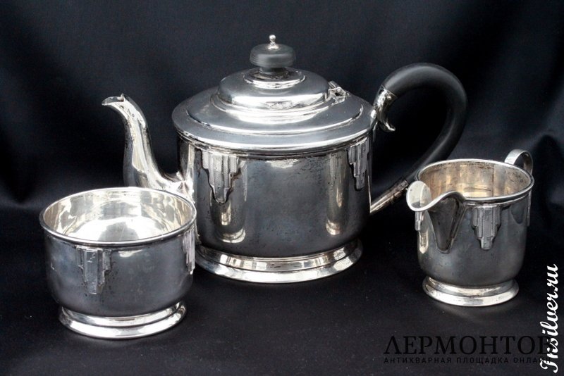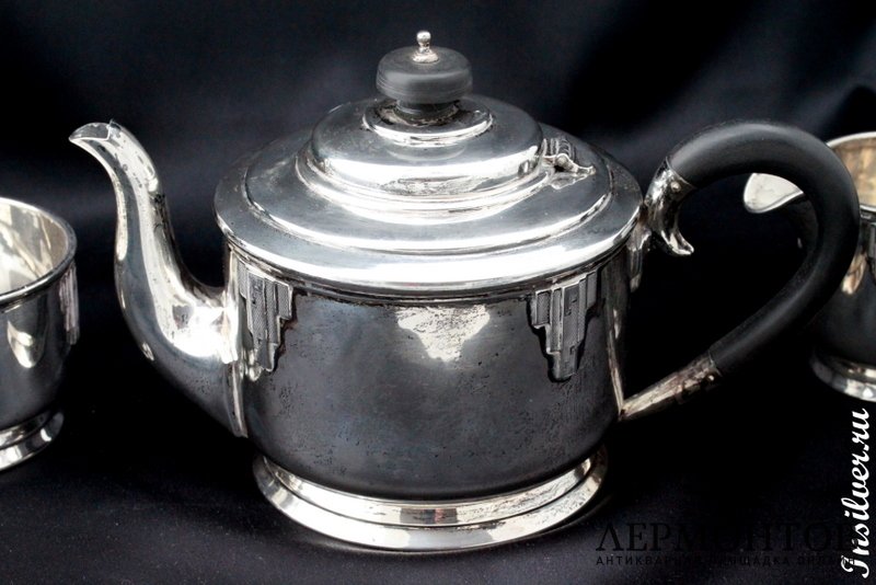 Чайный сервиз, изготовленный в Англии из серебра 925 пробы в 1934 году. Состоит из трех предметов: чайника, молочника и сахарницы. Предметы выполнены очень массивно и сохранены в отличном состоянии.