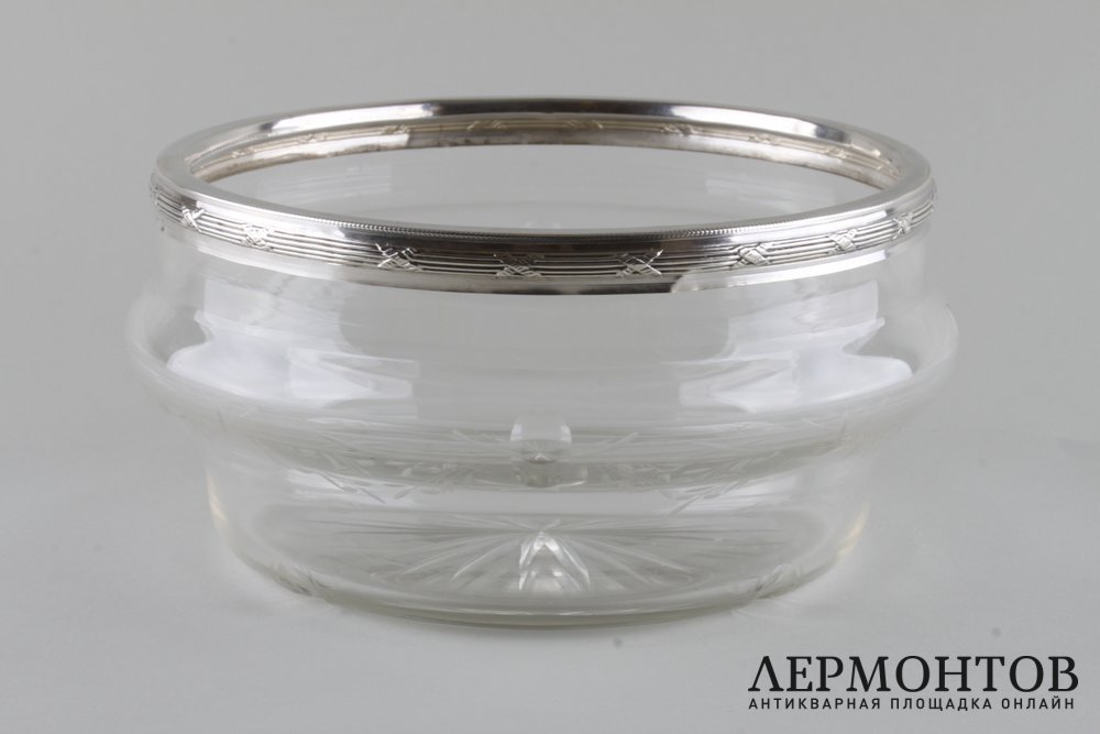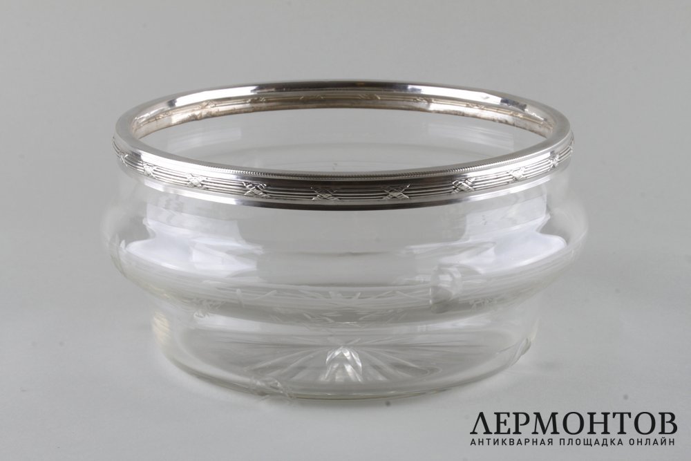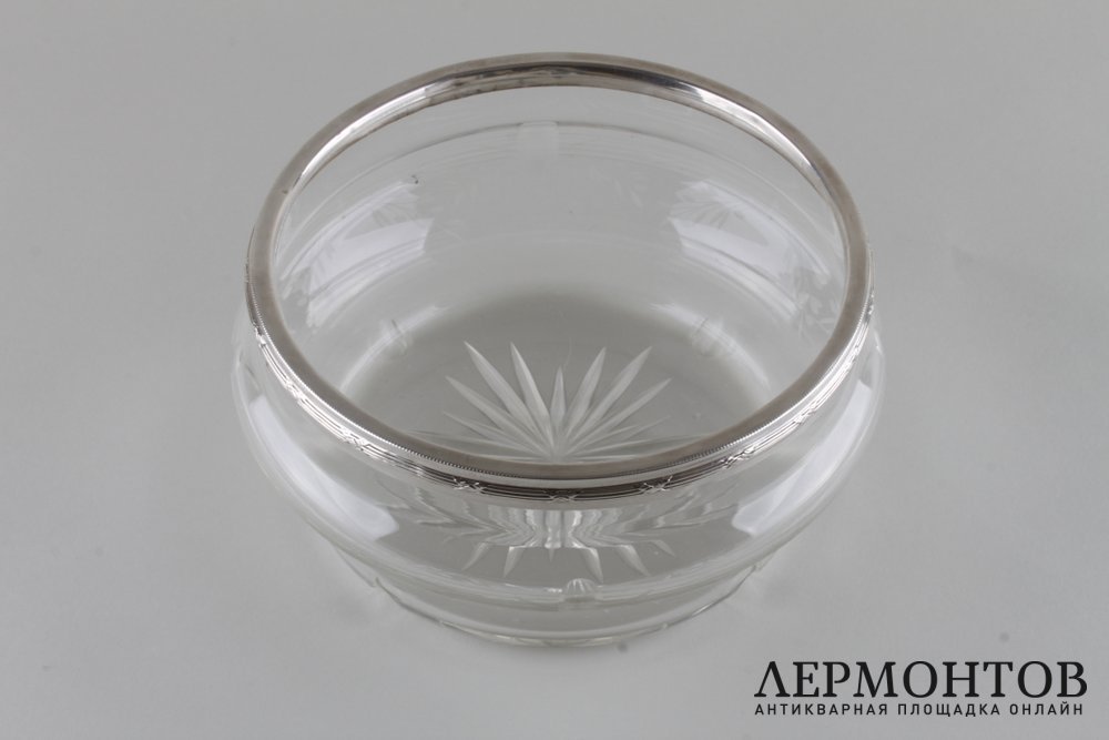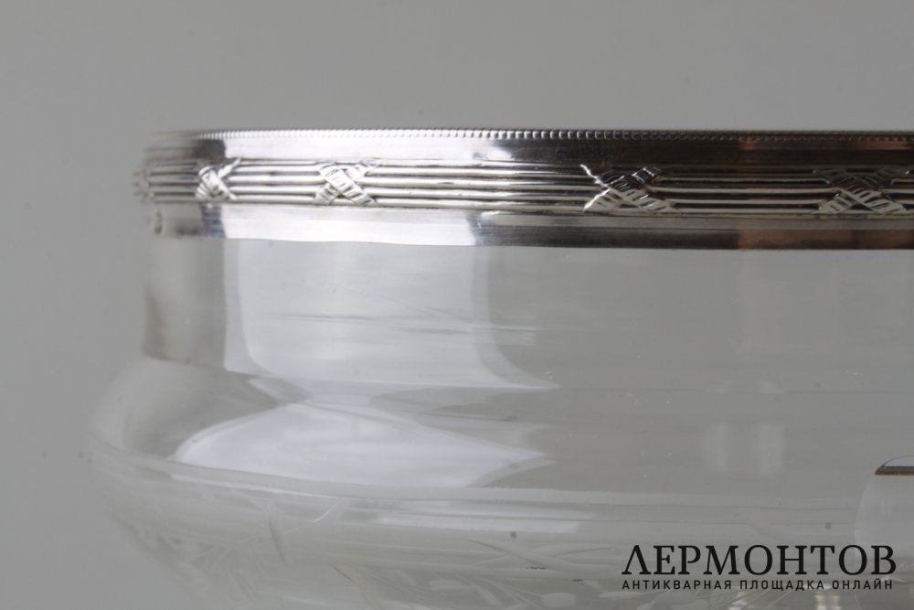 Антикварная чаша из стекла с серебряным ободом. Выполнена в стиле ампри. Изготовлена во Франции в конце XIX - начале XX веков. Чаша с резьбой и травлением по стелку. Сохранена в отличном состоянии!