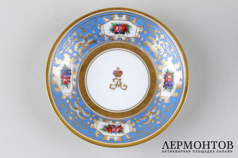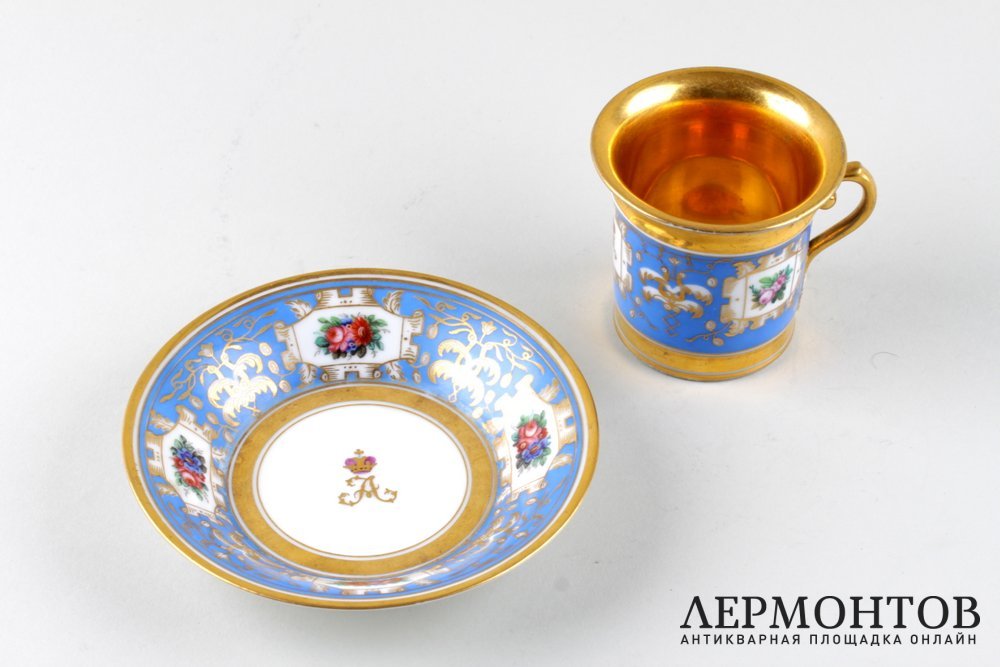 Антикварная фарфоровая чайная пара из сервиза Великого князя Александра Николаевича с монограммой «А» под Императорской короной. Изготовлена на Императорском фарфоровом заводе во второй половине XIX века. Украшена росписью, золочением. Сохранена в отличном коллекционном состоянии без сколов и реставраций.