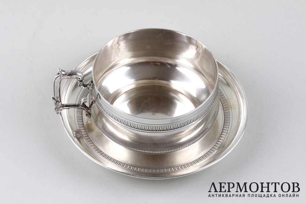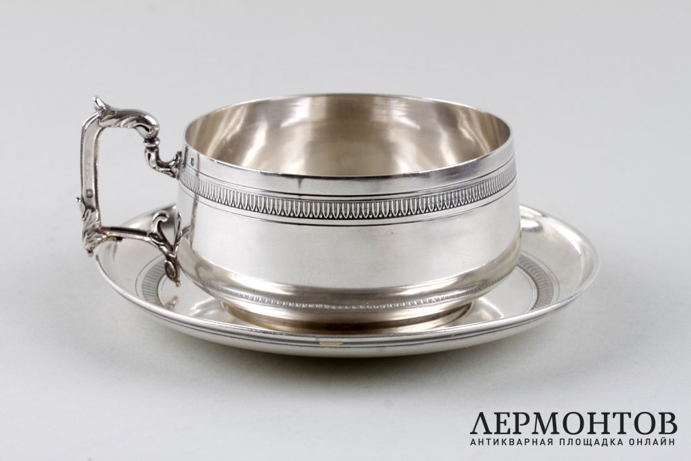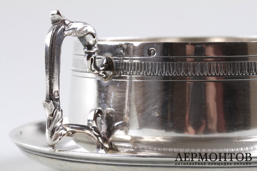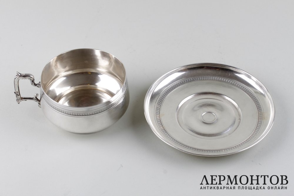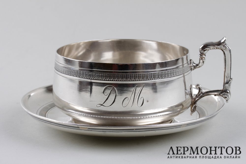 Антикварная чайная пара в классическом стиле, изготовленная из серебра 950 пробы во Франции в Париже в конце XIX века. Выполнена в характерной стилю манере: тулово по периметру украшено узором в виде лавровых листьев, ручка с листьями аканта. Есть монограмма. Сохранена в хорошем состоянии!