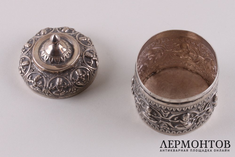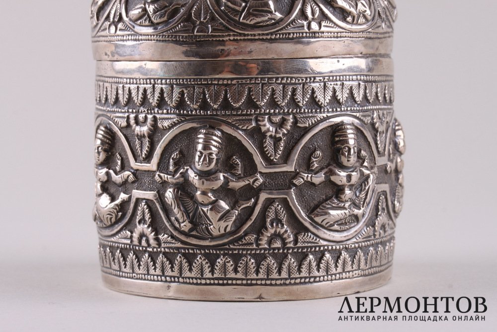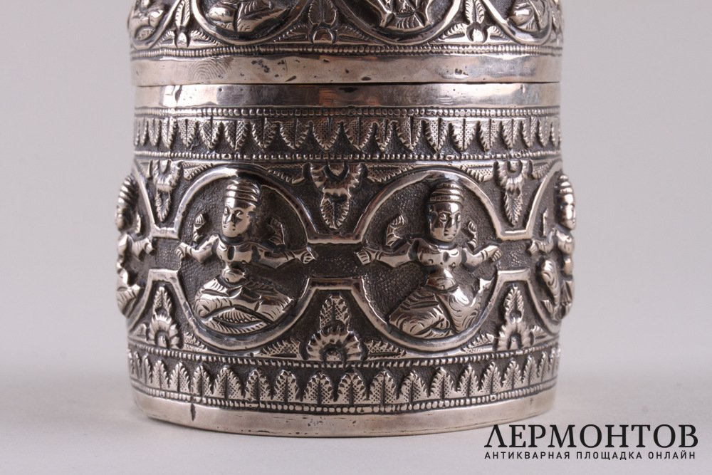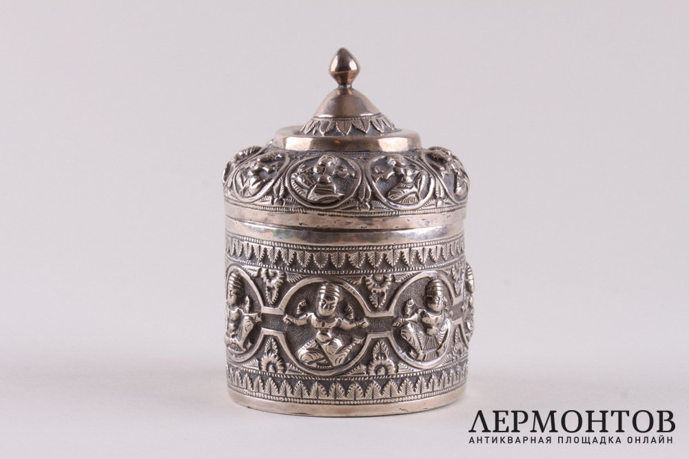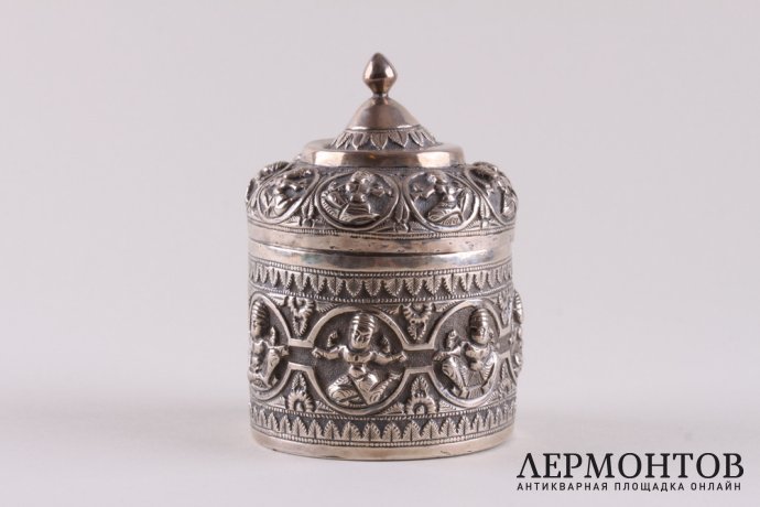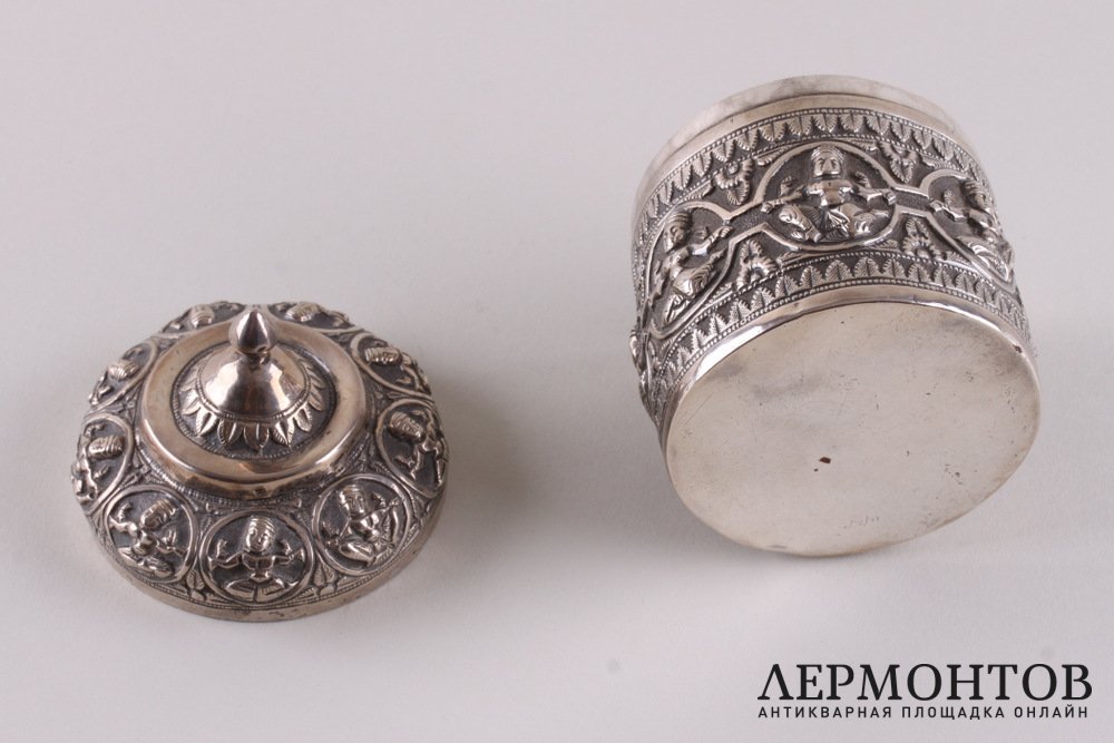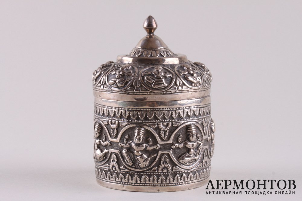 Редкая чайница, изготовленная из серебра не ниже 800 пробы в конце XIX - начале XX веков предположительно в Камбодже. Украшена восточным орнаментом.