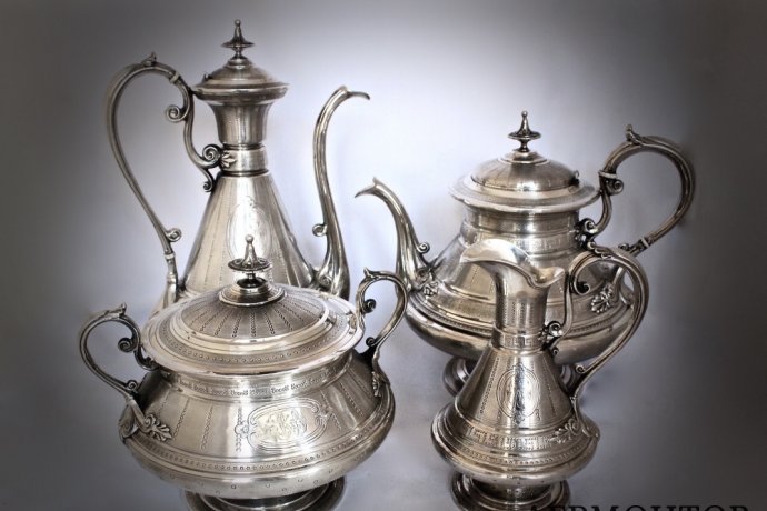 Старинный серебряный чайно-кофейный сервиз изготовлен во Франции в 19 веке. Состоит из молочника, сахарницы, кофейника и чайника. Все предметы выполнены из серебра 950 пробы (голова Минервы). Также на предметах стоит клеймо известного мастера EMILE HUGO. Между корпусом и рукоятями у чайника и кофейника имеются костяные вставки, которые предотвращают нагрев ручек. На боковой поверхности предметов нанесена изящная художественная гравировка вензеля. Сервиз выполнен с применением техники гильоширования.