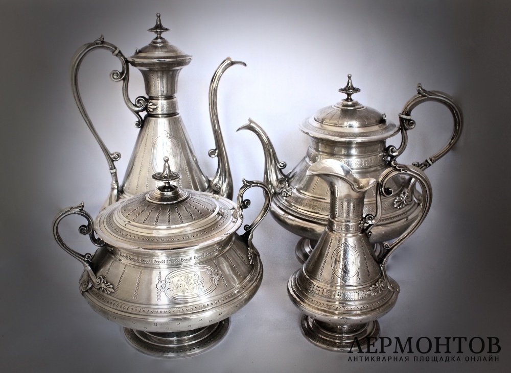Антикварный серебряный чайно-кофейный сервиз, мастерская Emile Hugo, годы активности 1853-1880. Париж, Франция.