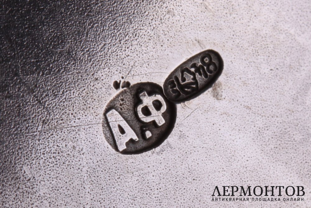 Обращаем ваше внимание на то, что изделие выполнено из серебра 84 пробы, о чем свидетельствуют клейма и экспертная оценка. Клейма: клеймо Московского пробирного управления с указанием пробы "84"; именник мастерской "А.Ф".