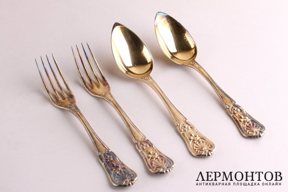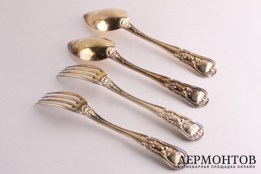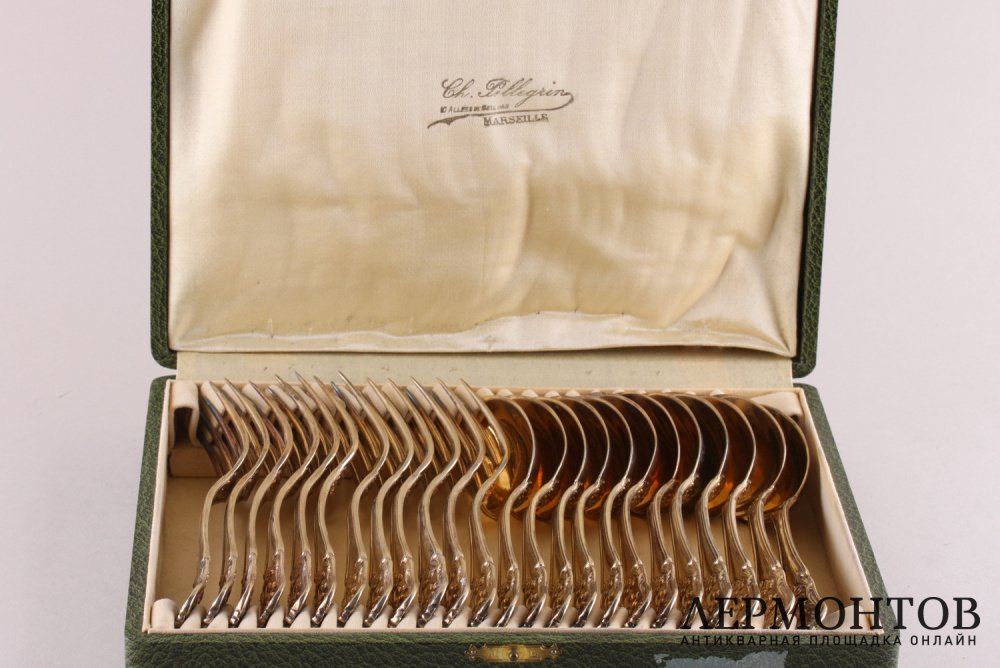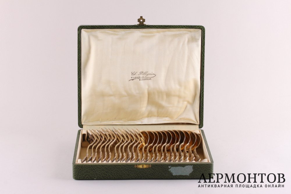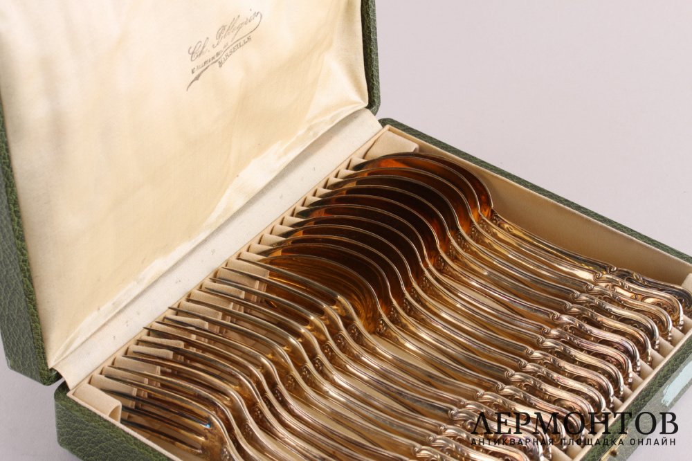 Антикварный комплект столовых приборов для десерта на двенадцать персон. Изготовлен из серебра 950 пробы во Франции в Париже в мастерской Maison Deniere в 1850 - 1855 годах. Предметы выполнены в классическом стиле. Красивое золочение. Есть монограмма "M.S".
