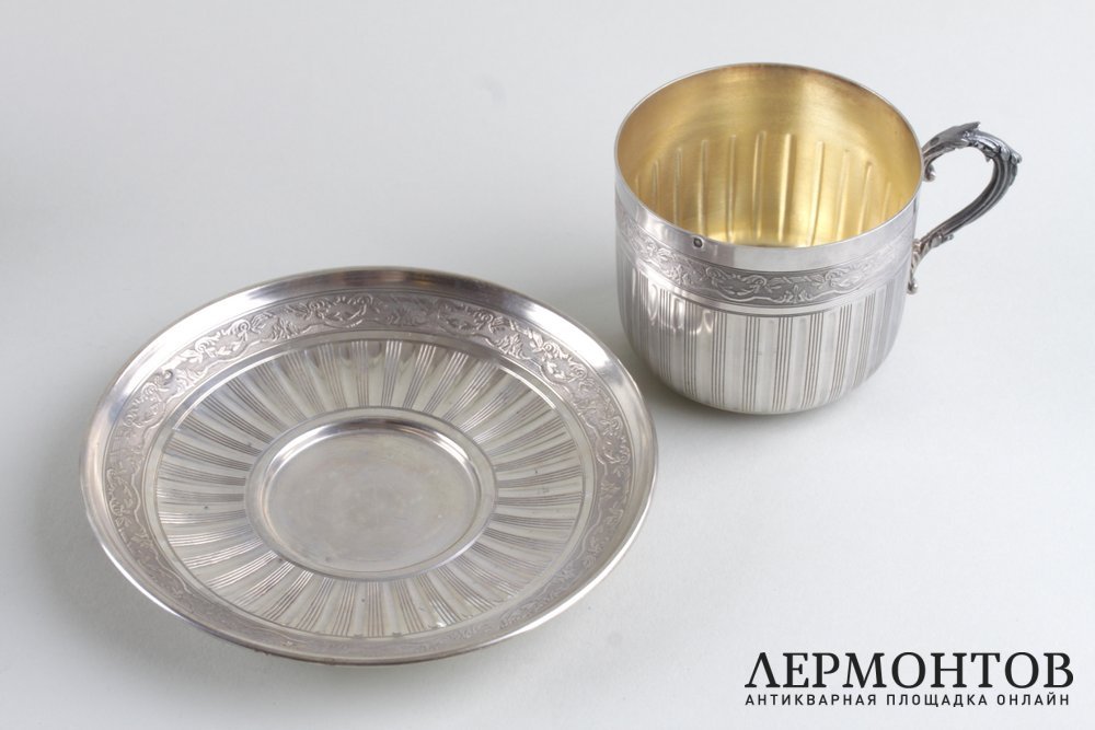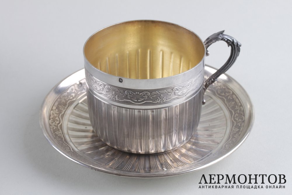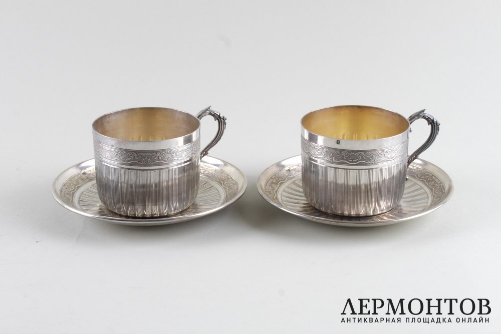Антикварный комплект из двух чайных пар в классическом стиле, изготовленных из серебра 950 пробы во Франции в Париже в конце XIX - начале XX веков. Выполнена в характерной стилю манере: чашка и блюдце украшены цветочным орнаментом. Чашки внутри покрыты позолотой. Изделия сохранены в отличном состоянии!