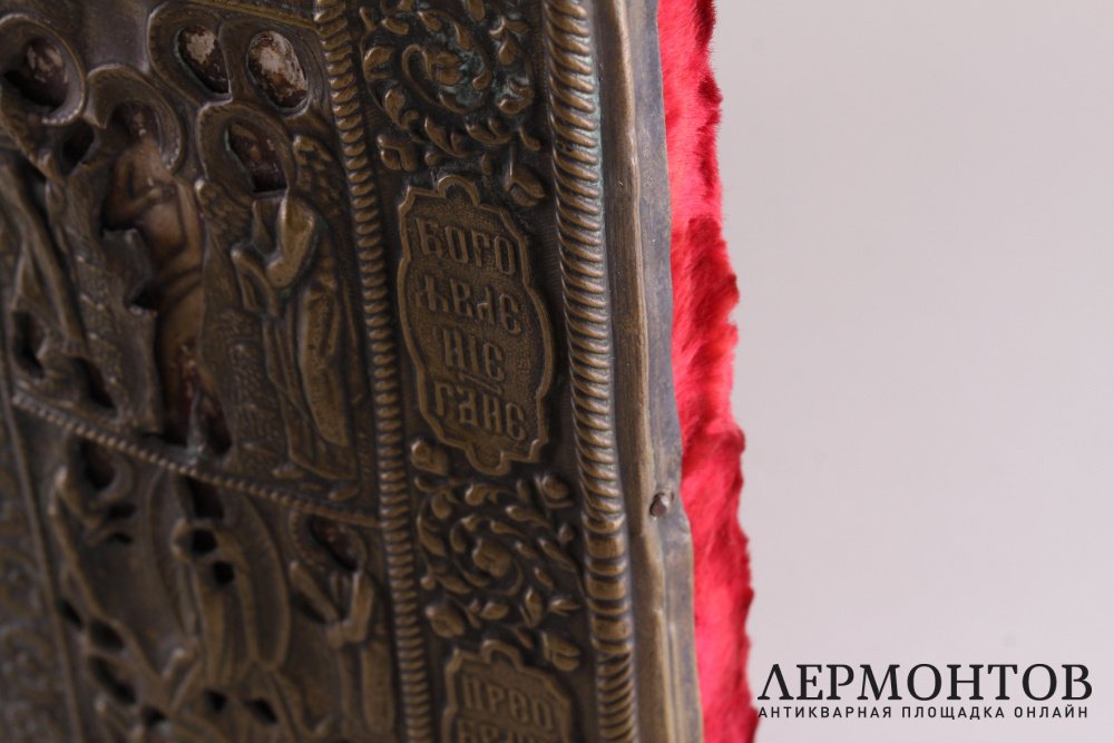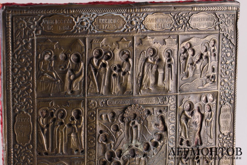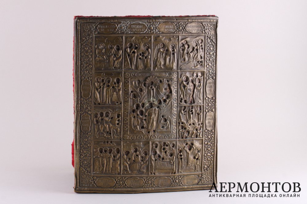 Икона "Двунадесятные праздники " в латунном окладе. ХIХ в. Хорошая сохранность. Обратная сторона иконы закрыта красным бархатом.