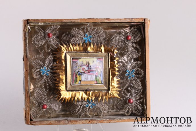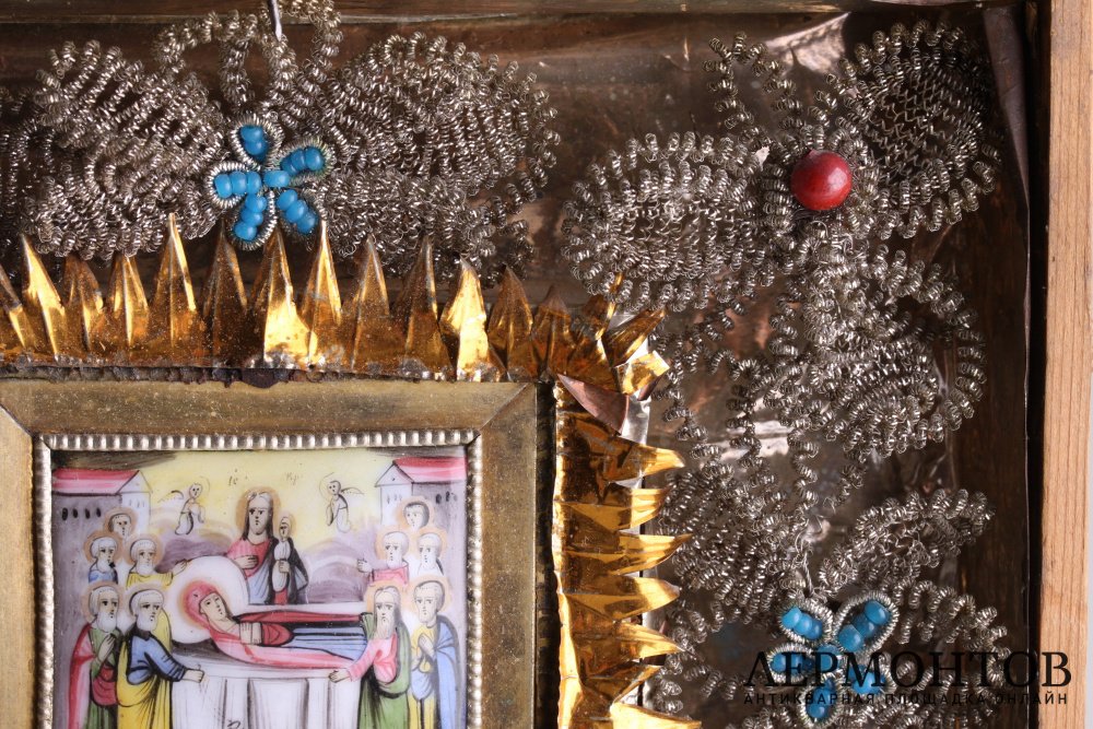 Икона "Успение Божией Матери". Эмаль, финифть, латунь.( украшения , проволочное плетение, бисер )  Размер эмали:6,5х5,5 см. Размер короба  19,5х16,5.