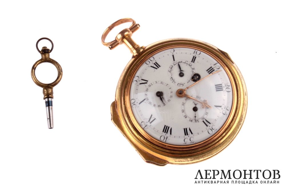 Старинные карманные часы, изготовленные в мастерской Vauchez в Париже в конце XVIII века. Корпус выполнен из трех цветов золота 750 пробы: желтого, розового и зеленого. С обратной стороны корпус украшен эмалью с рисунком и надписью: "A cet oiseau tu rend la liberte" (Этой птице ты даешь свободу). Циферблат белого цвета с римскими и арабскими цифрами. Отличное состояние корпуса. Механизм в рабочем состоянии, но необходима корректировка. В комплекте с часами идет латунный кейс.