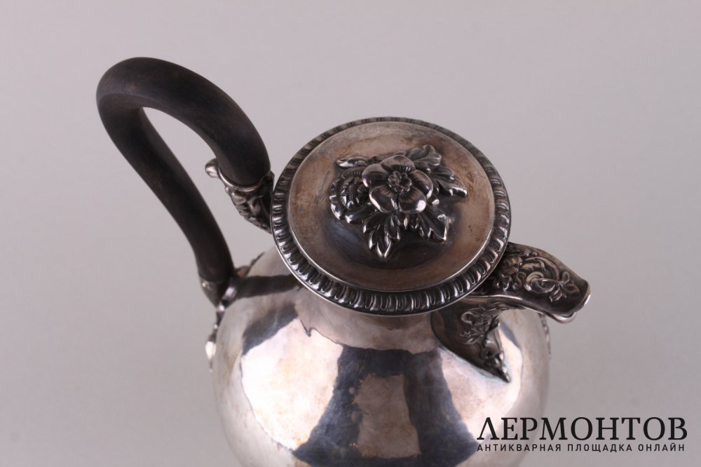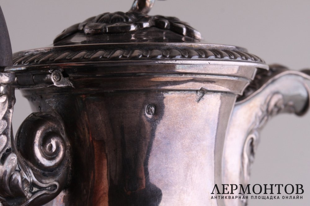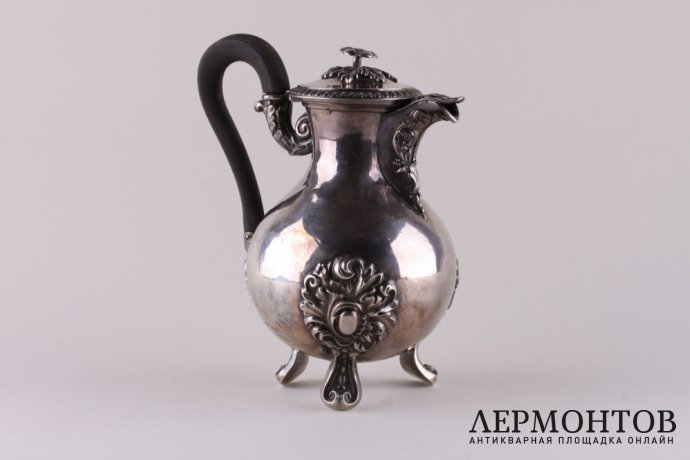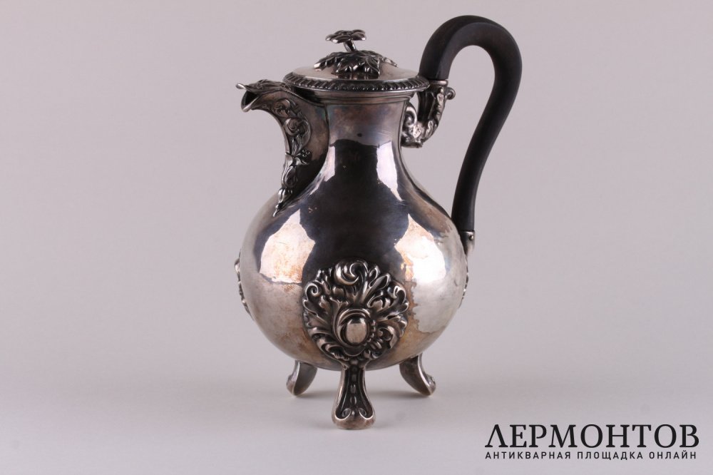 Антикварный кофейник из серебра 950 пробы, изготовленный во Франции во второй половине XIX века. Выполнен с элементами стиля барокко. Стоит на трех ножках. Ручка изготовлена из дерева. Хорошая сохранность.