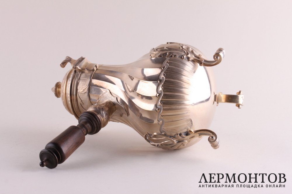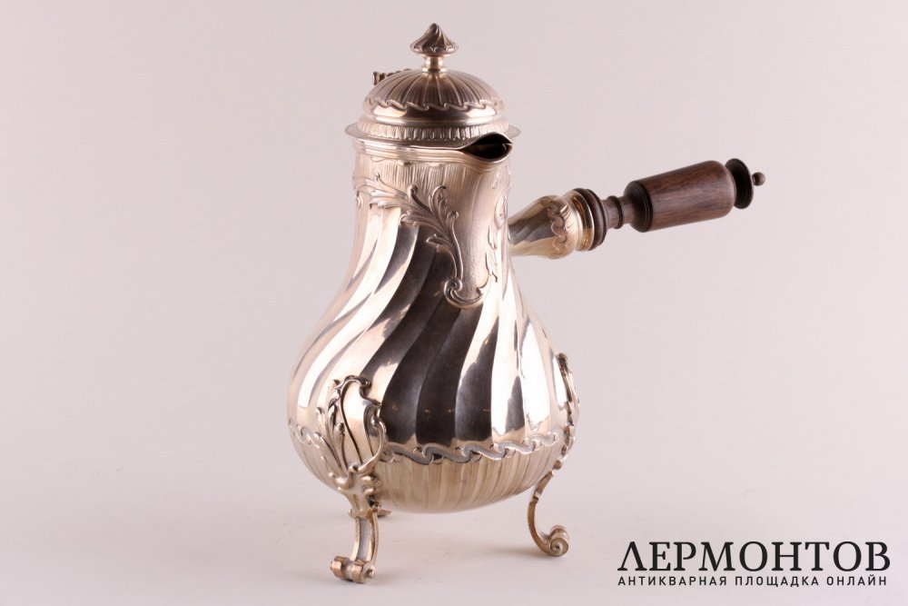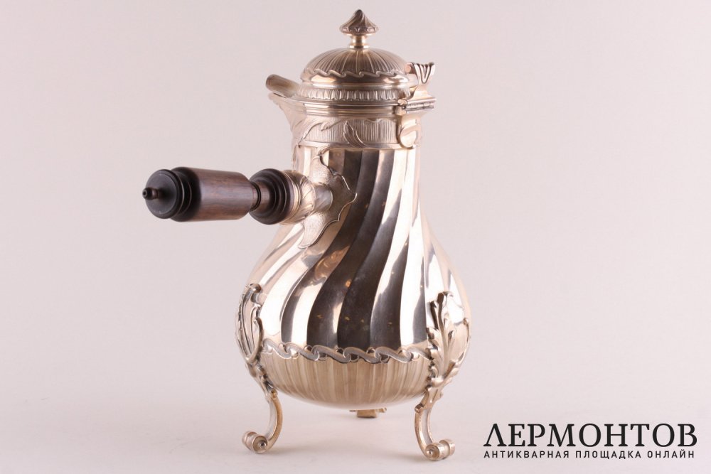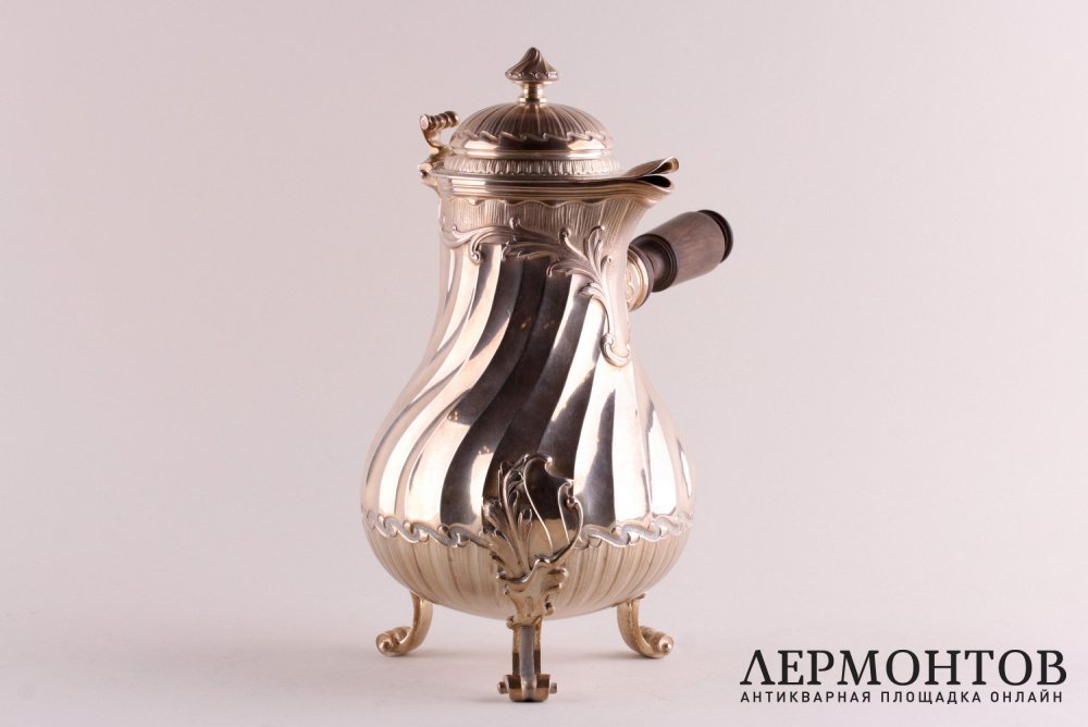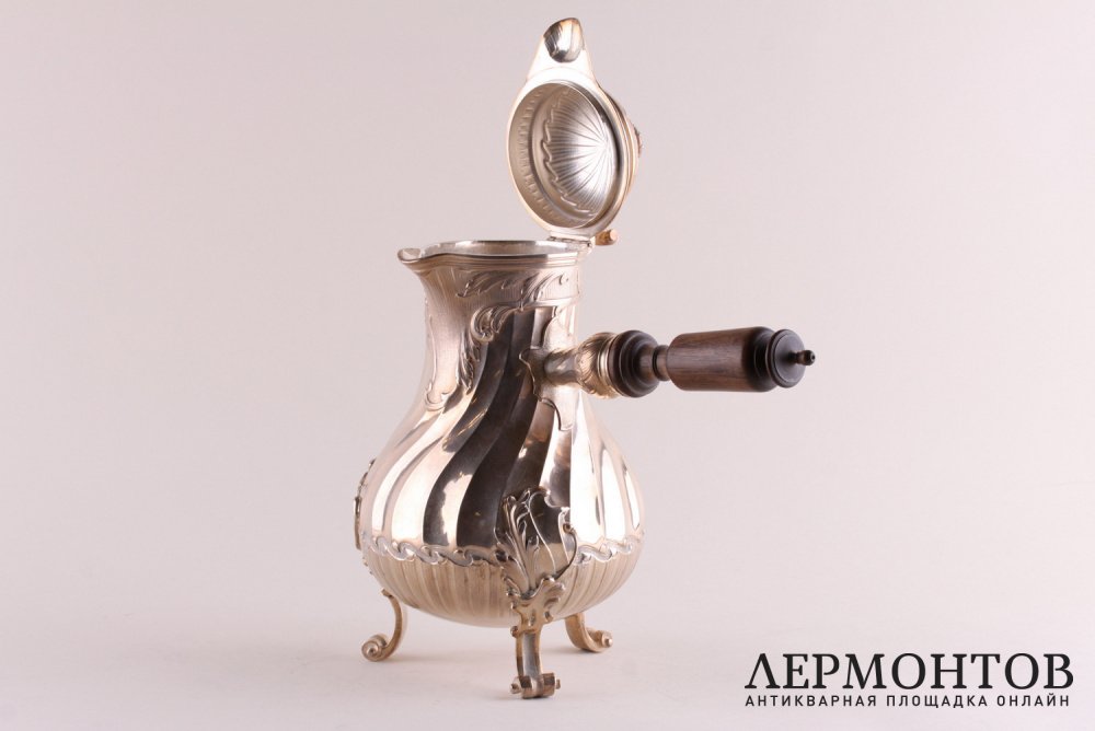 Антикварный кофейник из серебра 950 пробы, изготовленный во Франции в период между 1875 и 1891 годами в мастерской Fray Fils в Париже. Выполнен с элементами стиля рококо. Стоит на трех ножках. Ручка изготовлена из дерева и плотно закреплена. Отличная сохранность.