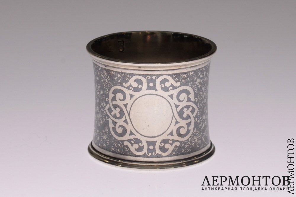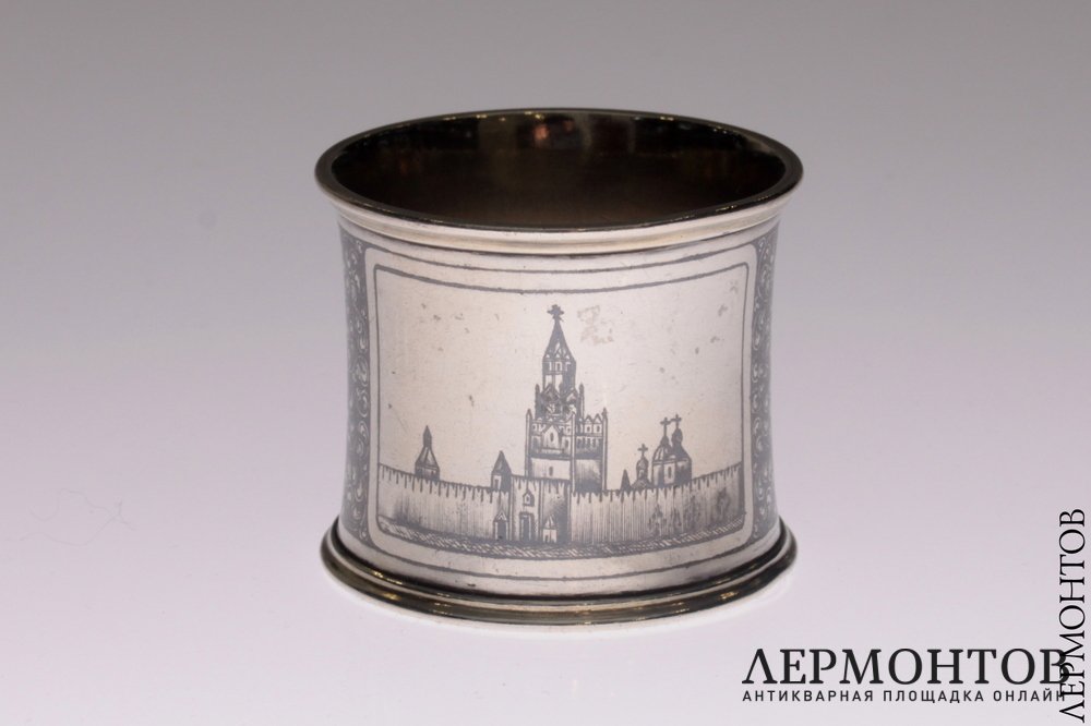 Салфеточное кольцо с черневым узором, изготовленное из серебра 84 пробы в Москве в 1882 году. Украшено черневым узором с видом на Кремль. Сохранено в хорошем состоянии. Отличный коллекционный предмет!
