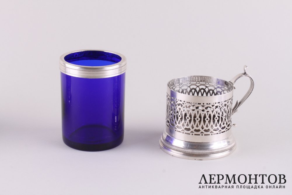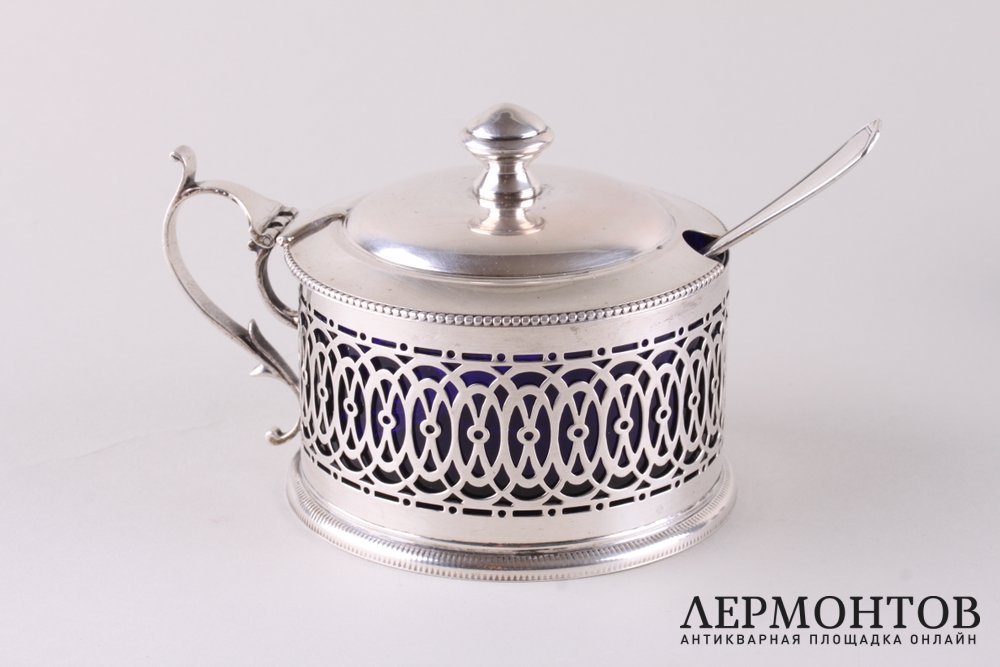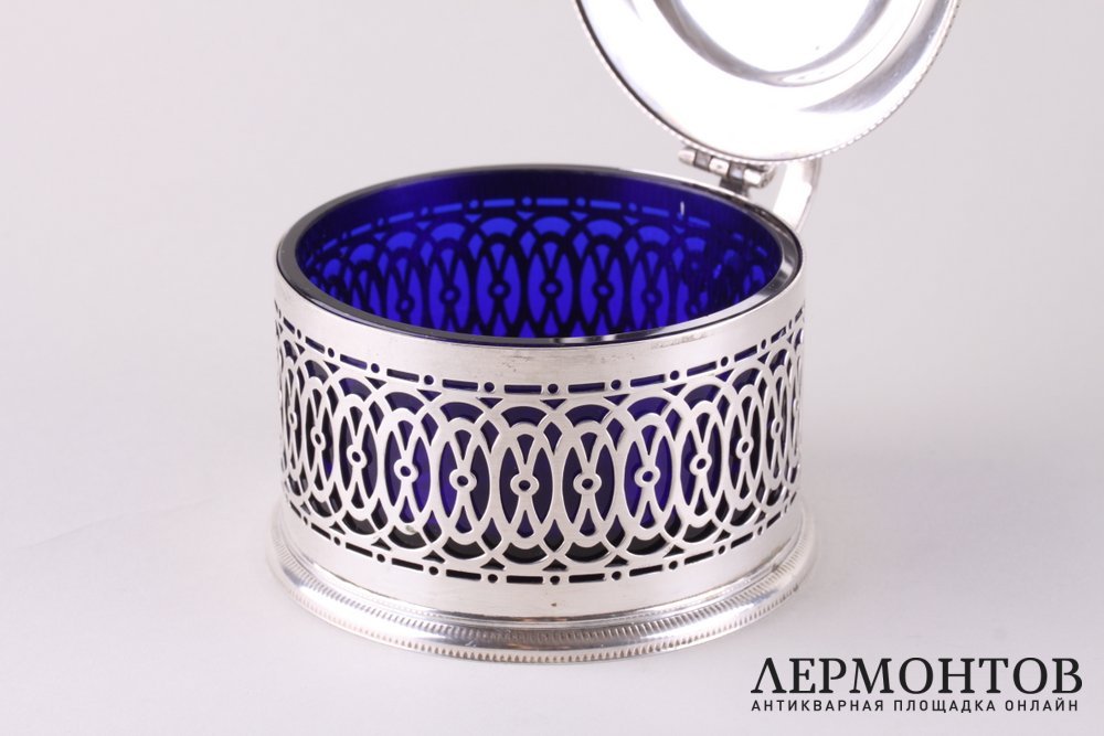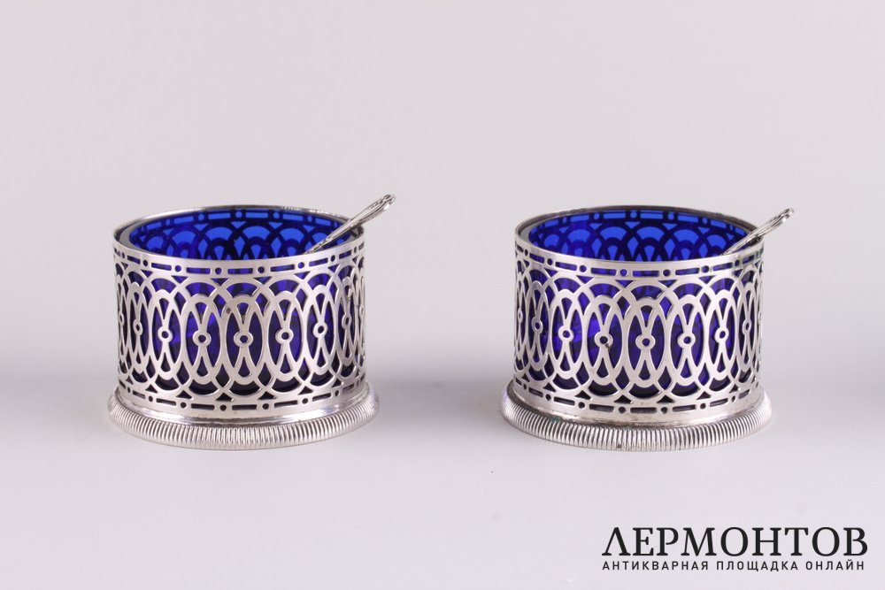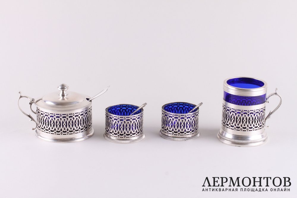 Замечательный комплект для закусок, изготовленный из серебра 800 пробы со вставками из синего кобальтового стекла. В комплекте вазочка с ложкой, две крупные солонки и стаканчик в виде подстаканника. Изделия выполнены в стиле ампир. Сохранены в отличном состоянии. Нет ни сколов, ни ударов.