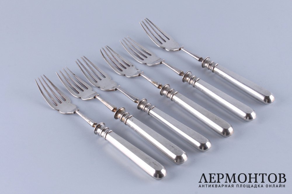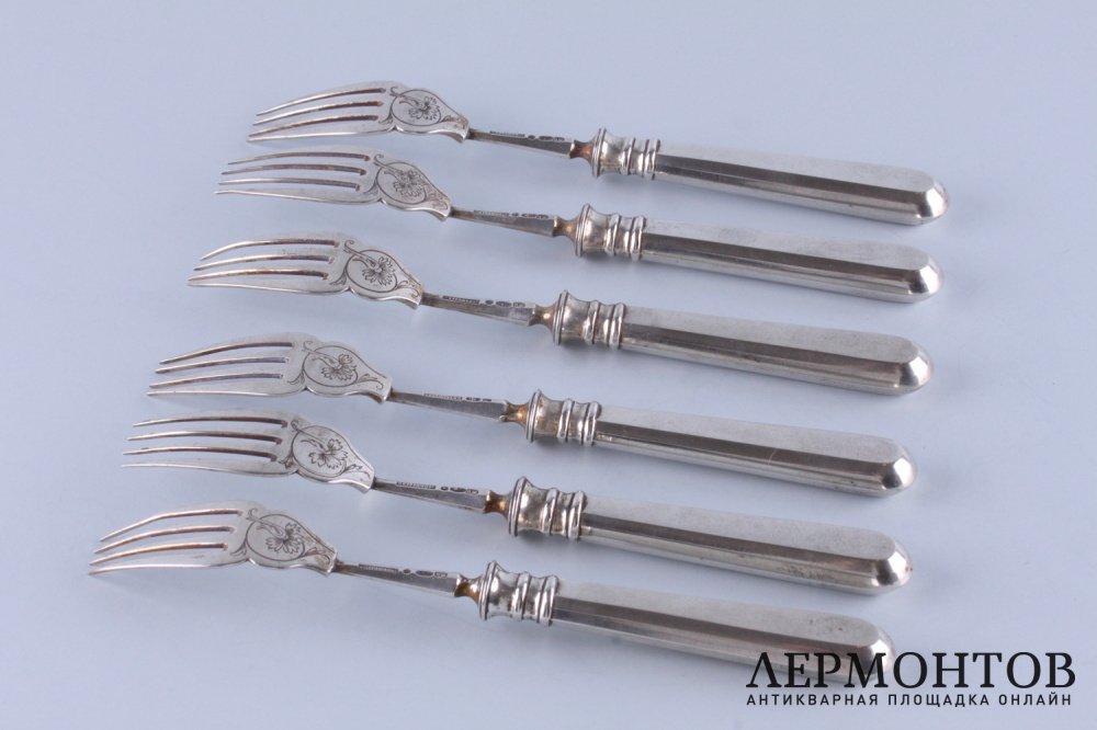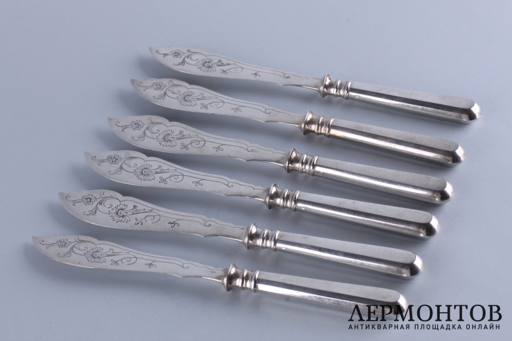 Комплект приборов для рыбы, состоящий из шесть вилок и ножей. Изготовлен из серебра 84 пробы в мастерской Шульгина Петра Петровича для фирмы Ореста Курлюкова в Москве 1908 - 1917 годах. Предметы выполнены в классическом стиле, украшены флоральным узором.