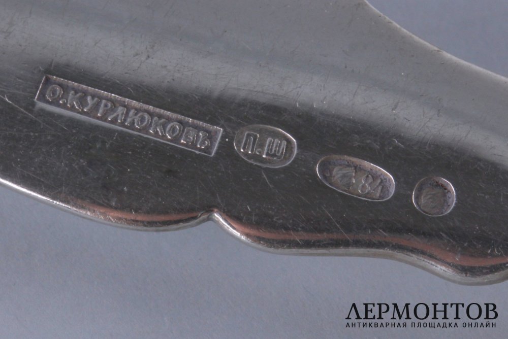 Клейма: клеймо Московского пробирного управления с указанием пробы "84"; клеймо мастерской Петра Шульгина "П.Ш" в овальном щитке; развернутое клеймо фирмы Ореста Курлюкова.