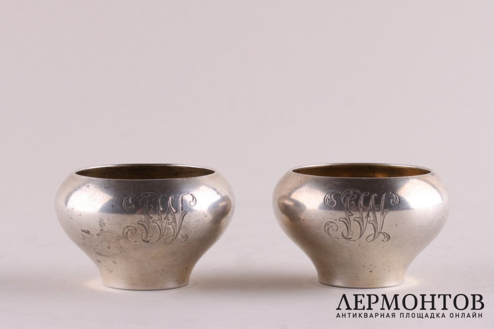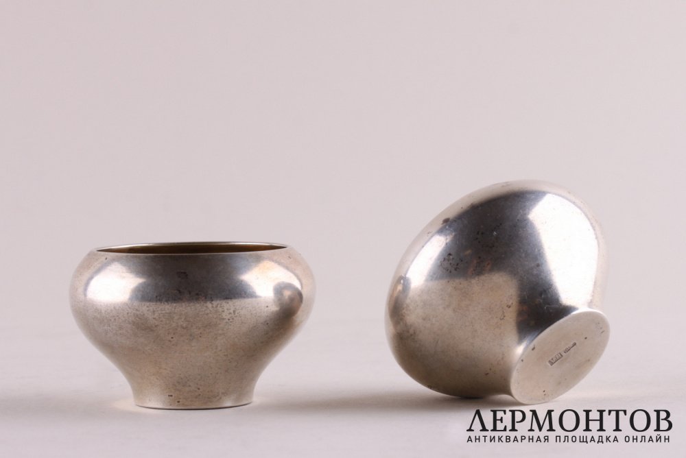 Комплект солонок из серебра 84 пробы, изготовленный в Российской империи в Москве в начале XX века. Солонки выполнены в форме чугунка. Внутри частично сохранилось золочение. Есть монограмма. Хорошая сохранность.