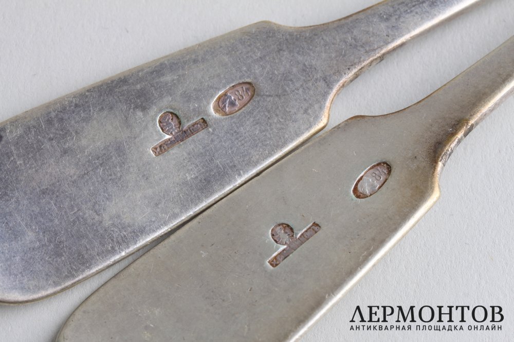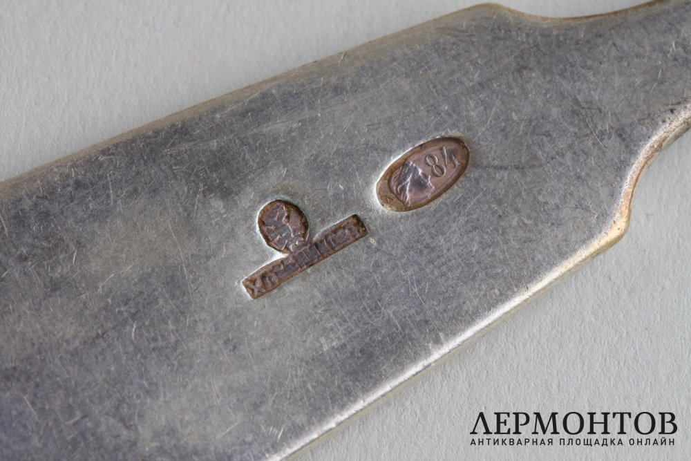 Обращаем ваше внимание на то, что изделия выполнены из серебра 84 пробы, о чем свидетельствуют клейма и экспертная оценка. Клейма: московское городское клеймо с цифровым обозначением пробы "84"; именник "ХЛЕБНИКОВ" в прямоугольном щитке; удостоверение придворного поставщика - двуглавый орел.