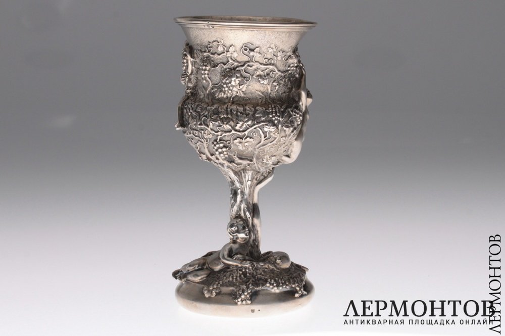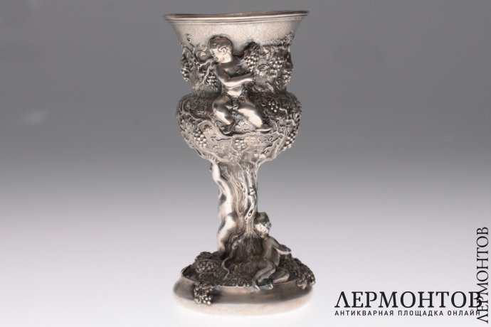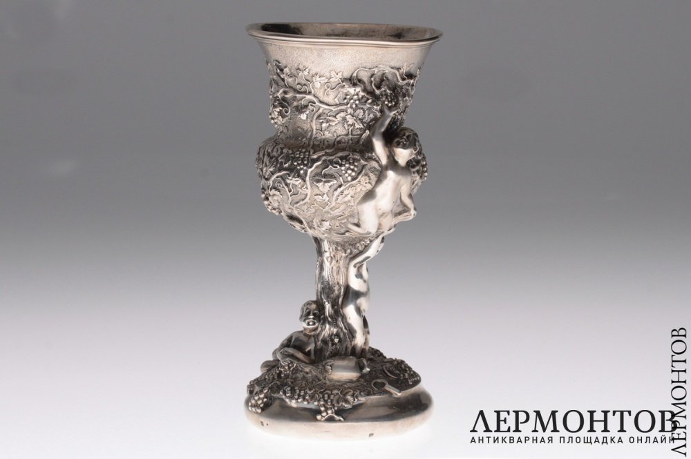 Редкий декоративный кубок, изготовленный в Голландии из серебра 934 пробы в 1851 году. Предмет украшен красивым объемным чеканным узором в виде виноградной лозы. Также на изделии изображены мифологические персонажи. Изделие сохранено в хорошем состоянии. Замечательный коллекционный предмет!