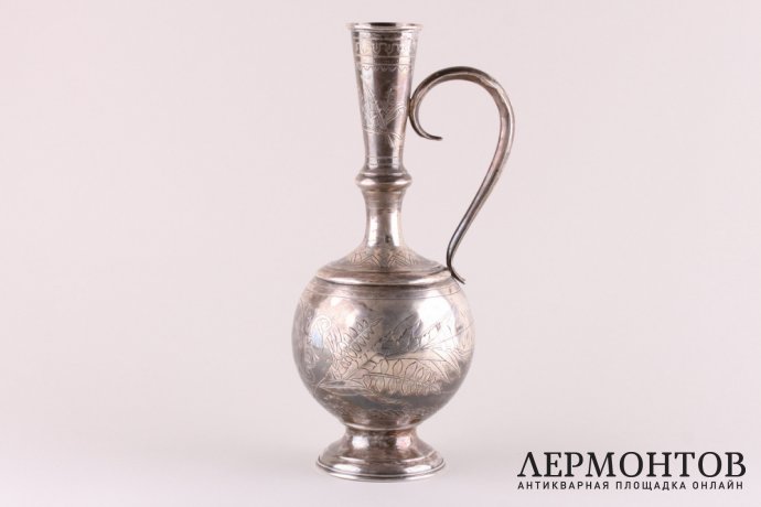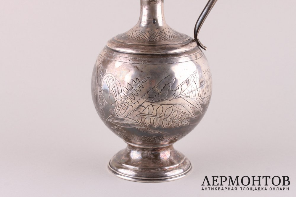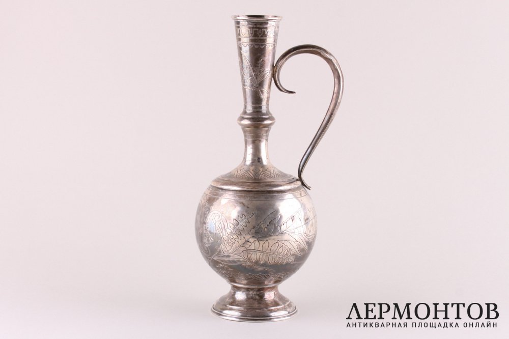 Антикварный кувшин из серебра 84 пробы, изготовленный в Москве в 1895 году. Выполнен в восточном стиле. Украшен резным штихельным орнаментом. Хорошая сохранность, реставрации.