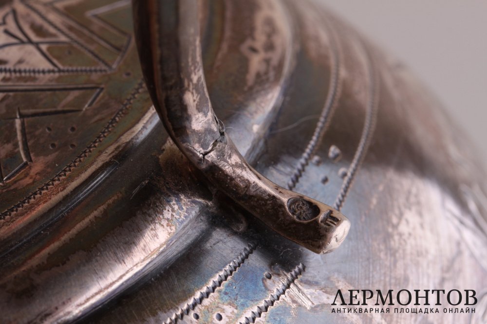 Обращаем ваше внимание на то, что изделие выполнено из серебра 84 пробы, о чем свидетельствуют клейма и экспертная оценка. Клейма: пробирное клеймо с цифровым обозначением пробы "84"; годовое клеймо "1893"; инициала пробирного мастера "Л.О"; клеймо Москвы - "Всадник с копьем". Размернутое клеймо мастерской "П. Милюков".