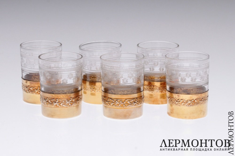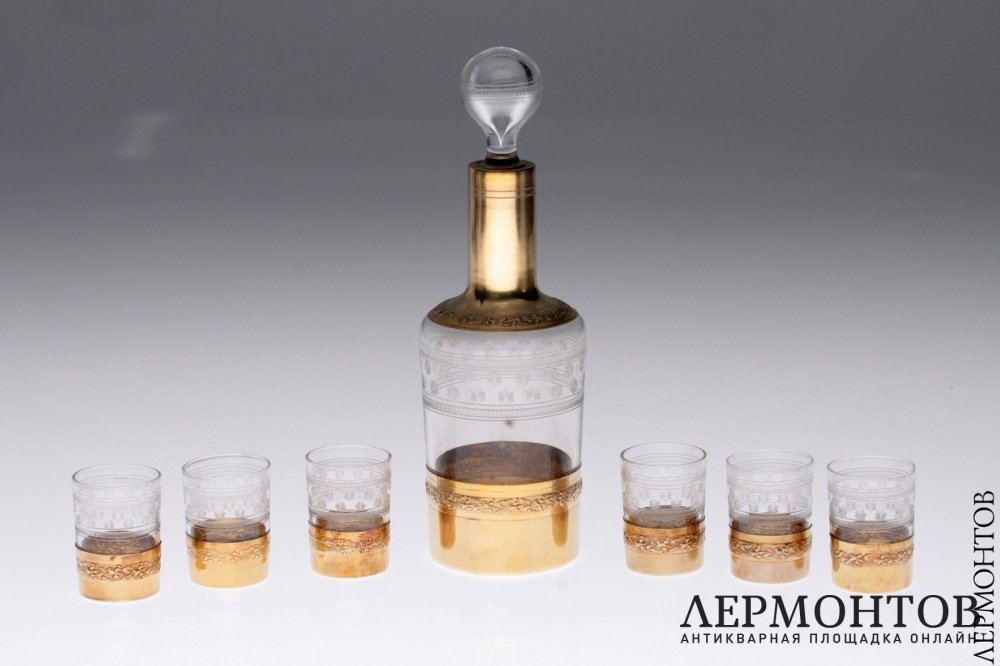 Замечательный набор для ликера, состоящий из декантера и шести стопок. Сервиз изготовлен выдающимися мастерами ювелирного ремесла Франции - мастерской Louis Ravinet & Charles D'Enfert с улицы du Temple 93 в Париже. Признанием заслуг мастеров стали полученные золотые медали Всемирных выставок в Лионе во Франции в 1894 году и в Брюсселе в Бельгии в 1897 году. Хрустальная часть изделия изготовлена известнейшей компанией Франции - Baccarat. Серебряные части изделий покрыты позолотой и украшены орнаментом в виде ирисов. Хрустальные части украшены гравировкой в виде звезд.