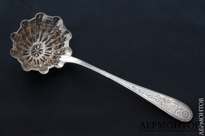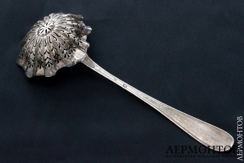 Редкая ложка для сахарной пудры, изготовленная из серебра 950 пробы во Франции в период между 1819-1838 годов. Частично покрыта позолотой, сохранена в хорошем состоянии.