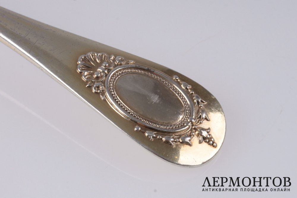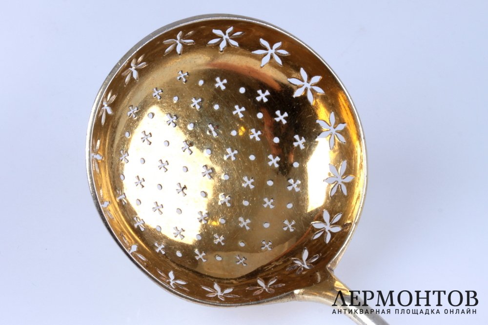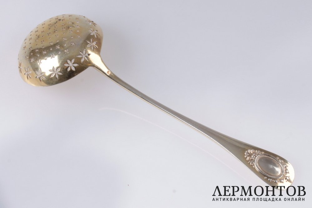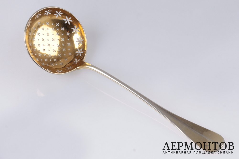 Ложка для сахарной пудры, изготовленная из серебра 950 пробы во Франции в период между в конце XIX - начале XX веков. Выполнена в классическом стиле, частично покрыта позолотой. Сохранена в очень хорошем состоянии.