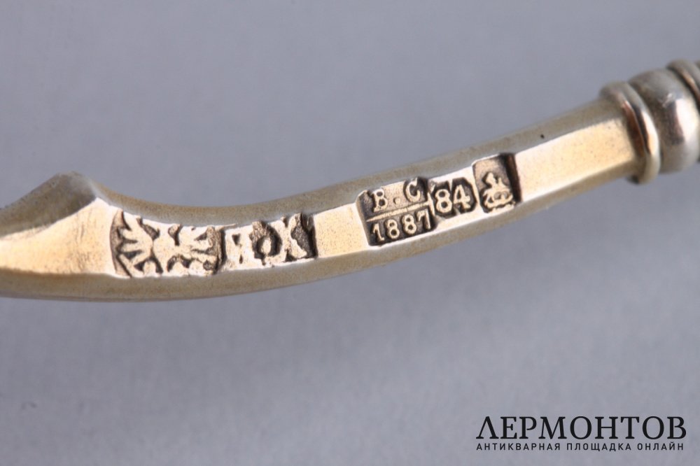 Обращаем ваше внимание на то, что изделие выполнено из серебра 84 пробы, о чем свидетельствуют клейма и экспертная оценка. Клейма: пробирного мастера "В.С" с годовым клеймом "1887"; цифровое обозначение пробы "84"; городское клеймо Москвы - "Всадник"; именник мастерcкой "И.Х" с двуглавым орлом.