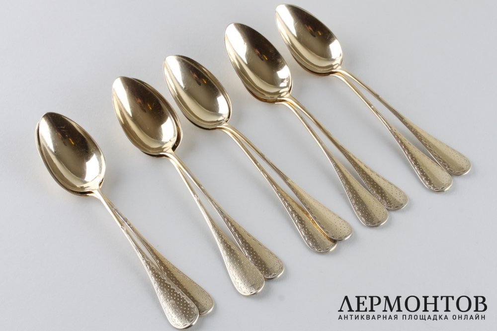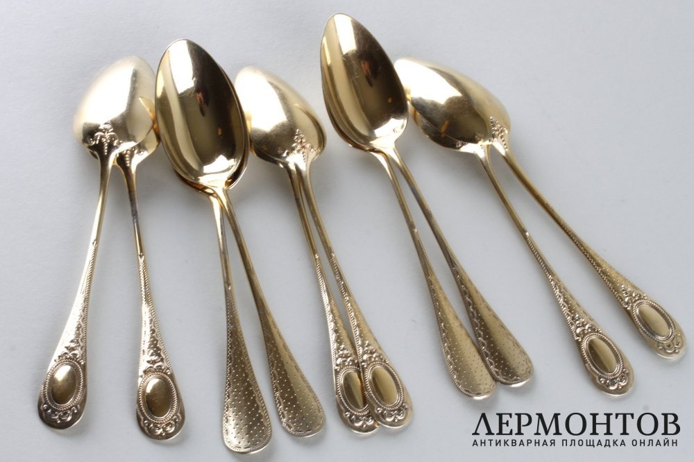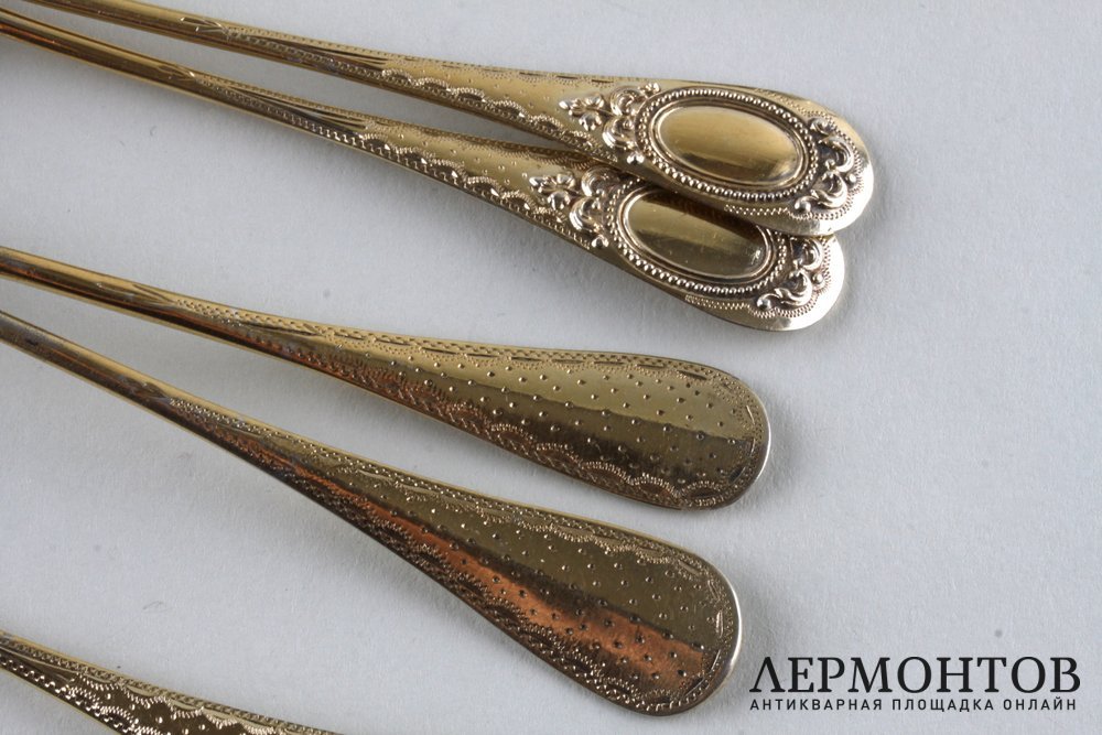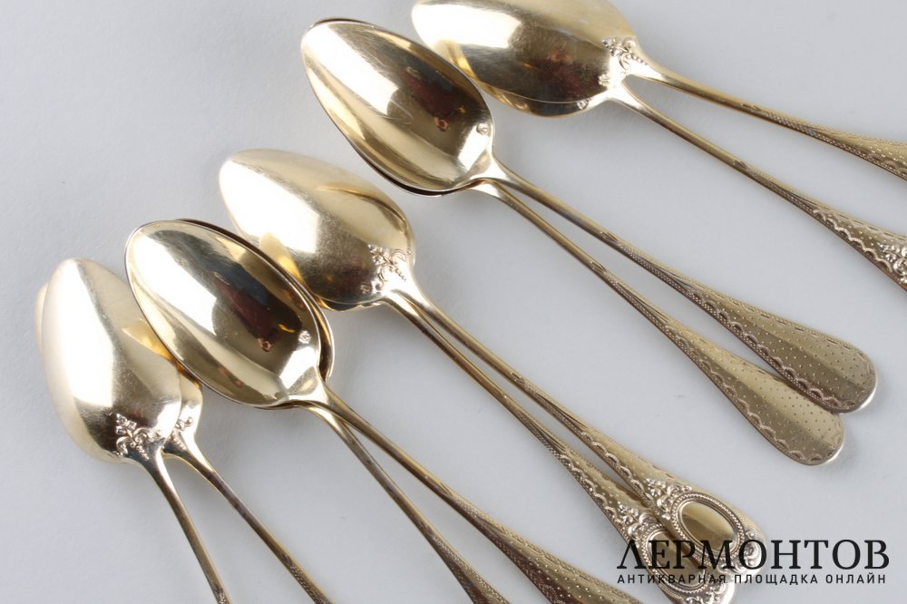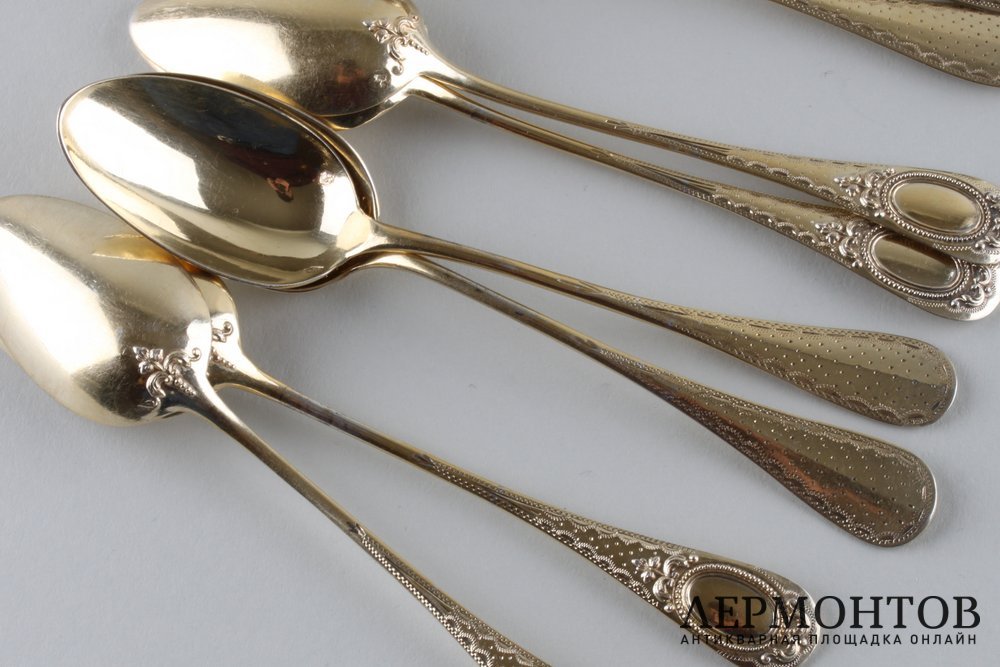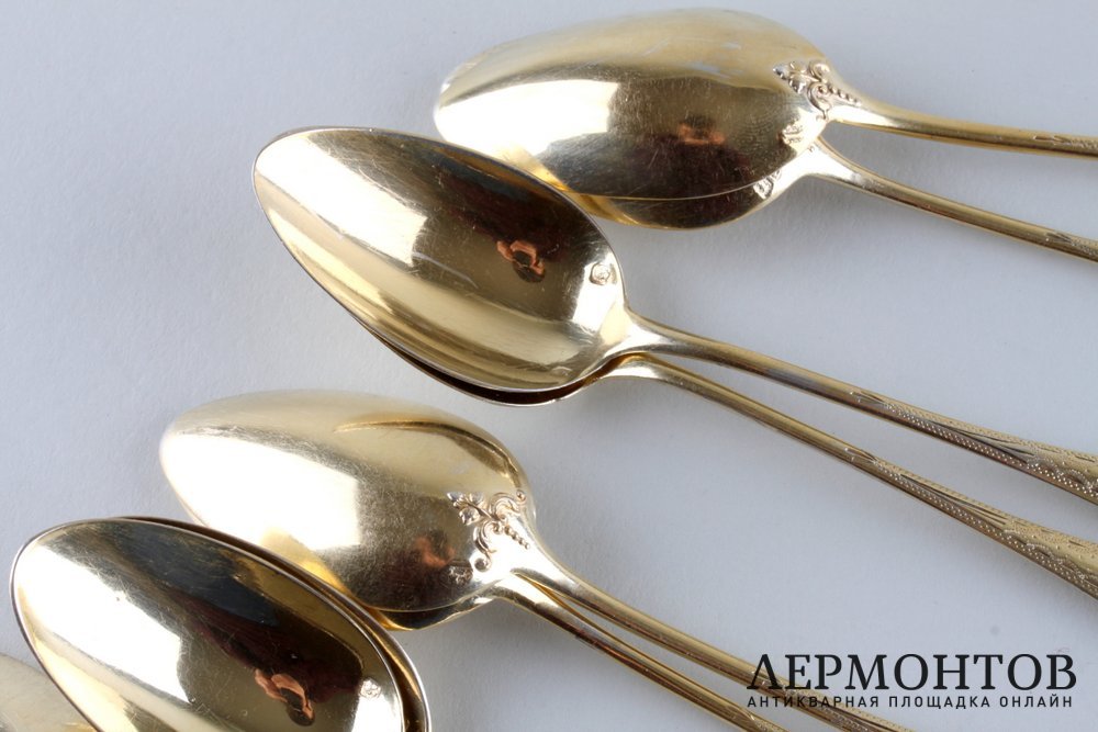 Набор антикварных чайных ложек, изготовленных из серебра 950 пробы в Париже во второй половине XX века. В комплекте десять ложек, выполненых в стиле ампир. Изделия сохранены в отличном состоянии. Золочение.