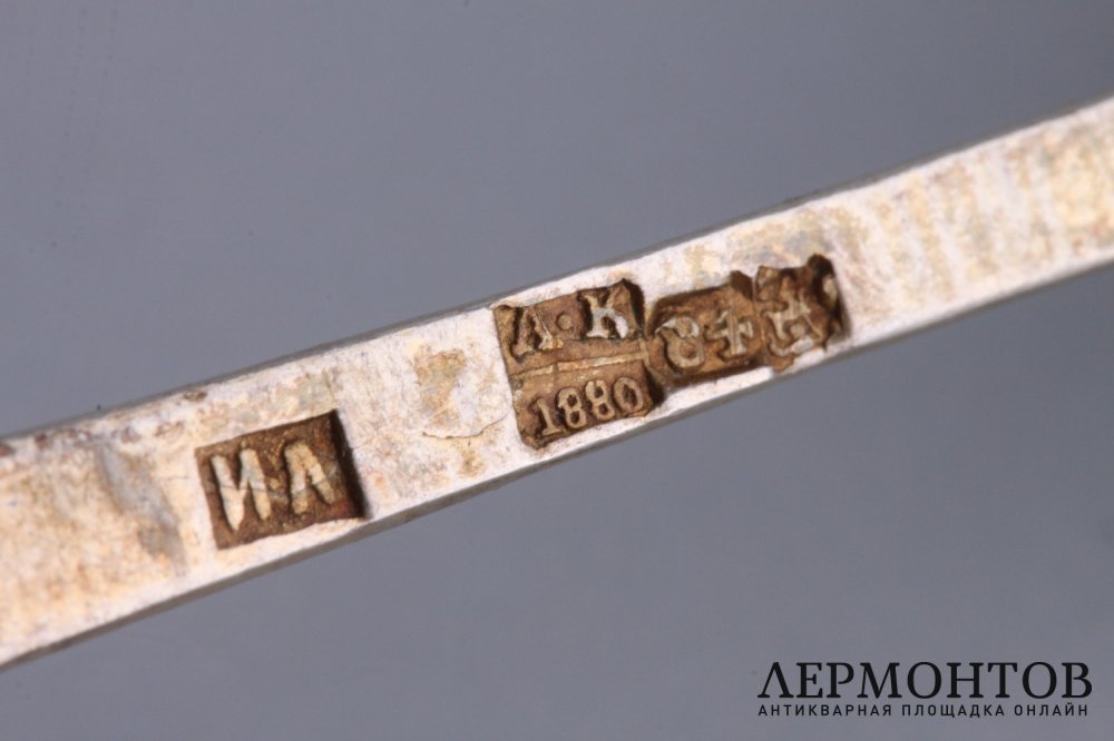 Обращаем ваше внимание на то, что изделия выполнены из серебра 84 пробы, о чем свидетельствуют клейма и экспертная оценка. Клейма: пробирное клеймо Москвы - "Всадник с копьем"; "А.К" - пробирного мастера c указанием года "1880"; цифровое обозначение пробы "84"; именник мастерской "ИА".