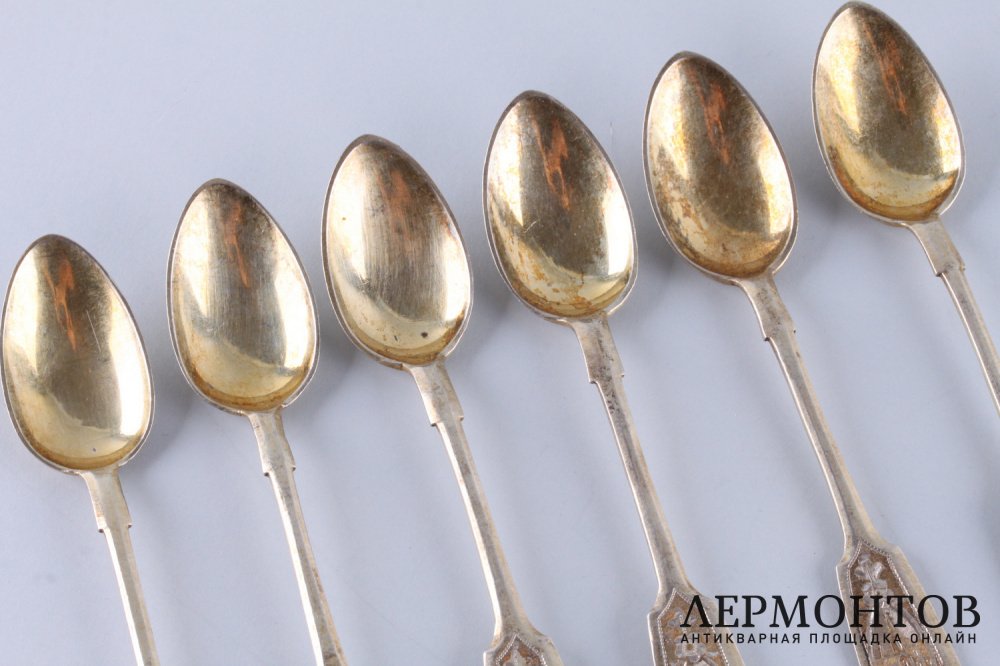 Комплект чайных ложек, изготовленный из серебра 84 пробы в мастерской Ивана Алексеевича Алексеева (П.-Л. 2472) в Москве в 1880 году.