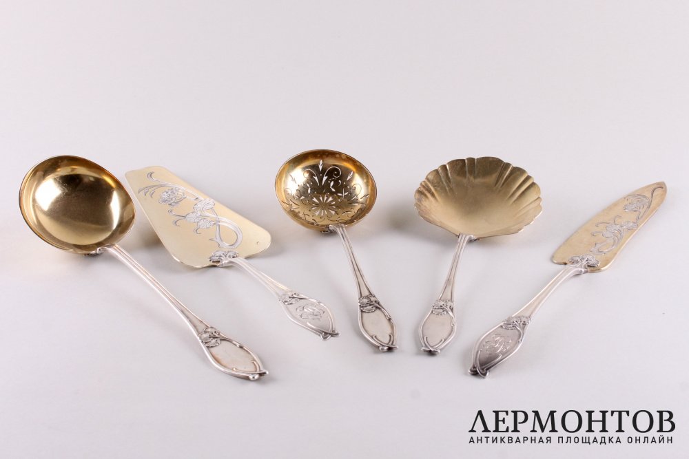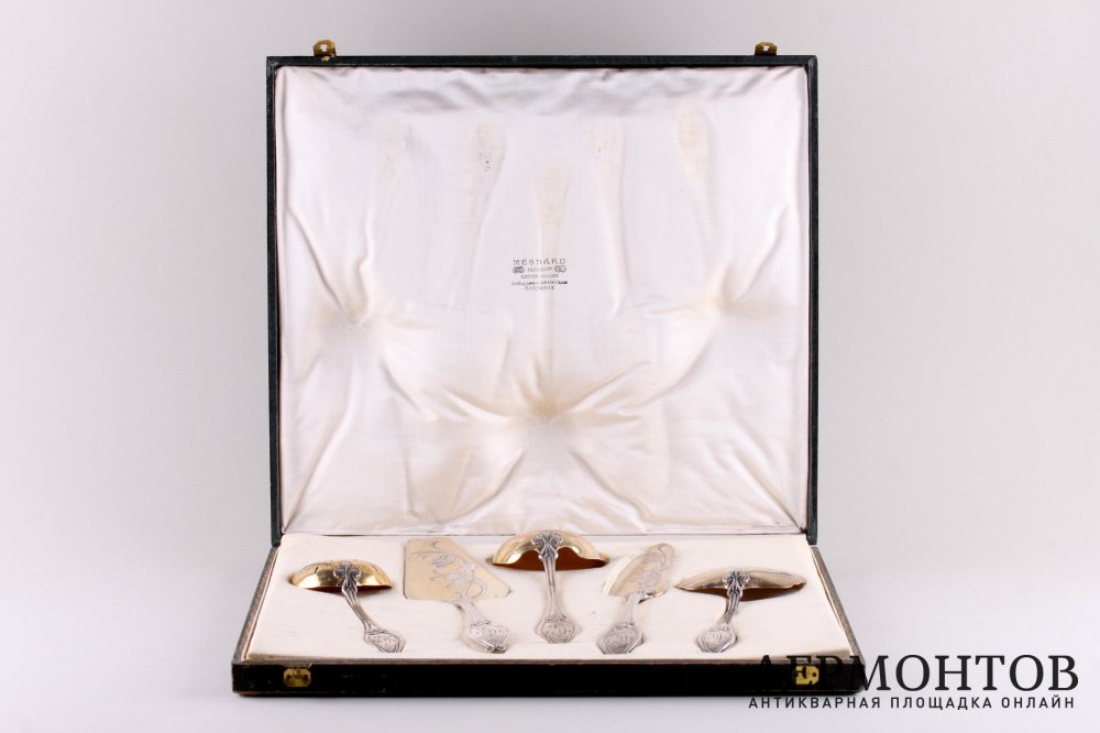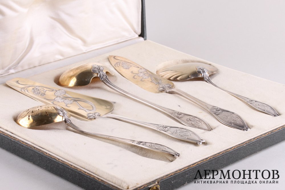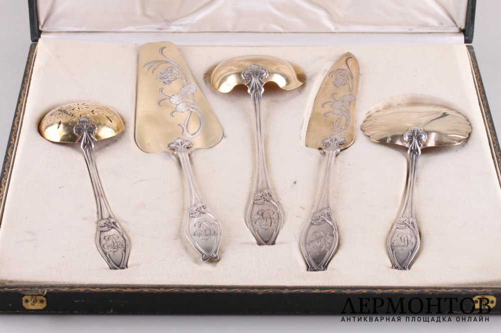 Антикварный комплект из пяти приборов для сервировки десертов. Изготовлен из серебра 950 пробы во Франции в Париже в мастерской Henin et Cie в конце XIX века в стиле модерн. Украшен характерным стилю орнаментом. Сохранен в отличном состоянии в оригинальной коробке.