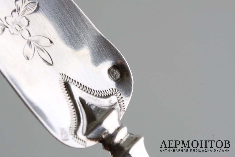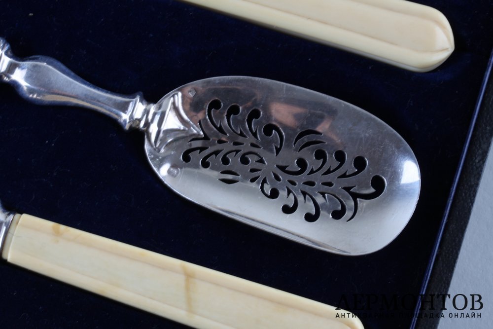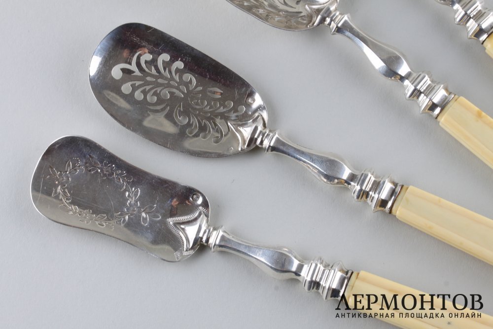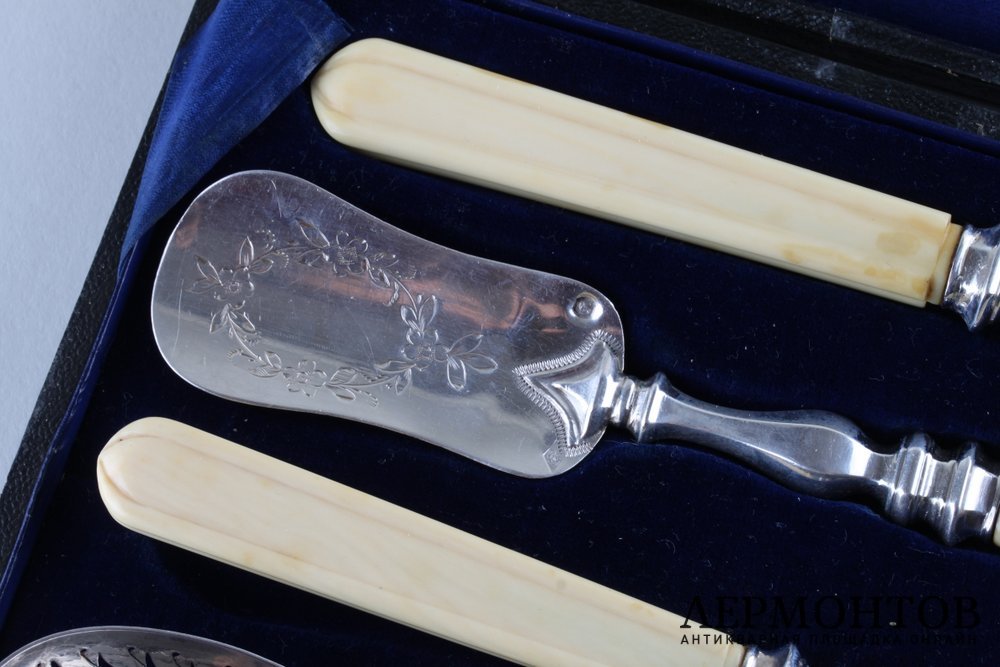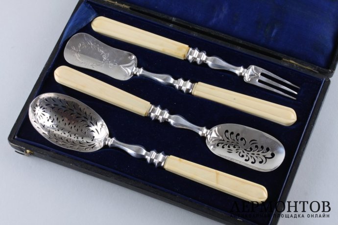 Набор для закусок, изготовленный во Франции в XIX веке из серебра 950 пробы в мастерской Benoit & Lanos. В комплекте четыре предмета, ручки выполнены из кости. Предметы выполнены в классическом стиле и сохранены в очень хорошем состоянии.