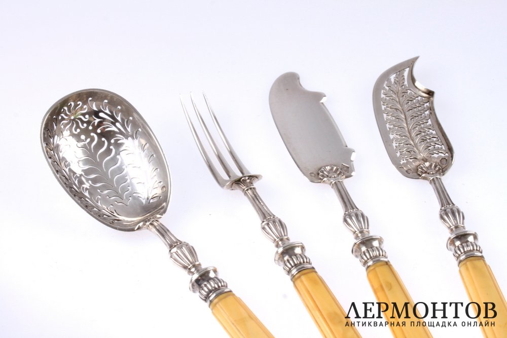 Набор для закусок, изготовленный во Франции в первой половине XIX века из серебра 950 пробы. Набор изготовлен в мастерской известного ювелирного дома Maison Cardeilhac, который являлся поставщике французского королевского двора.