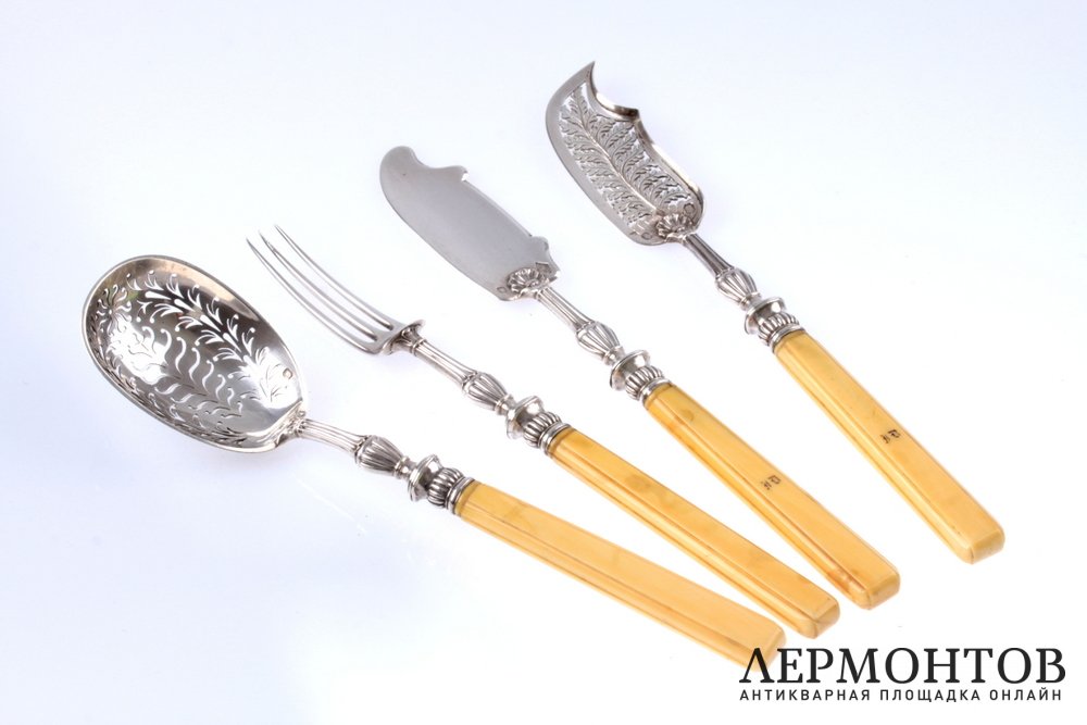 В комплекте четыре предметы, ручки выполнены из кости. Предметы выполнены в классиеском стиле и сохранены в очень хорошем состоянии.