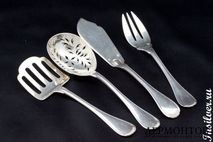 Набор для закусон из четырех предметов изготовлен во Франции из серебра 950 пробы в начале XX века. Сохранен в хорошем состоянии. Интересный подарок!