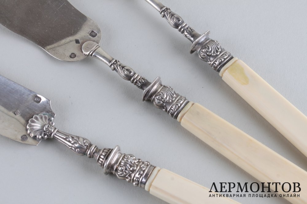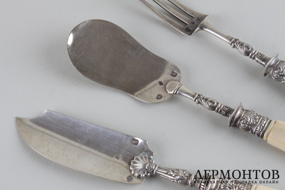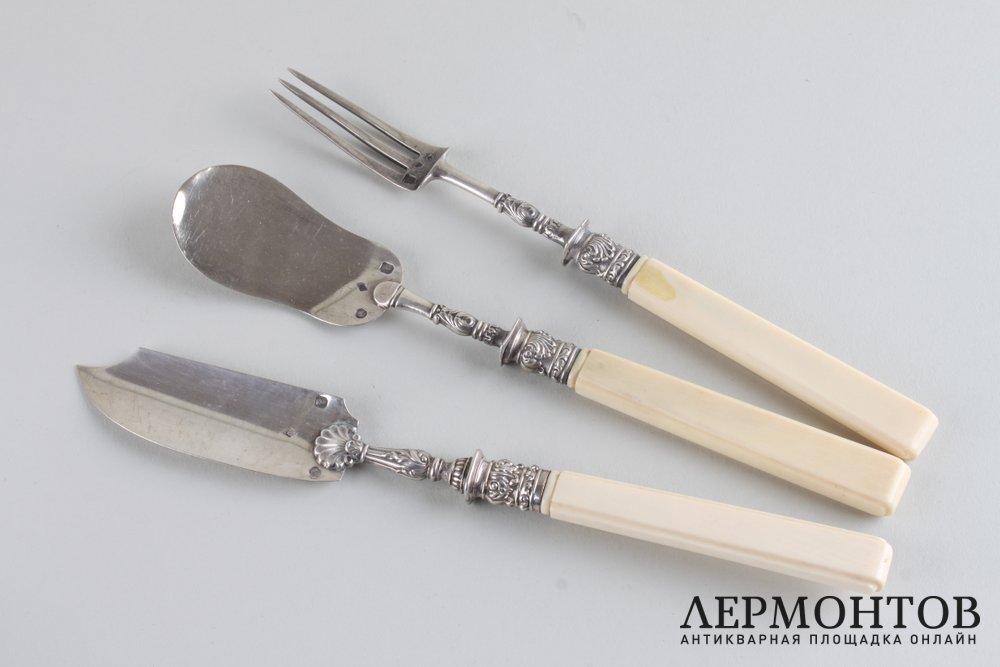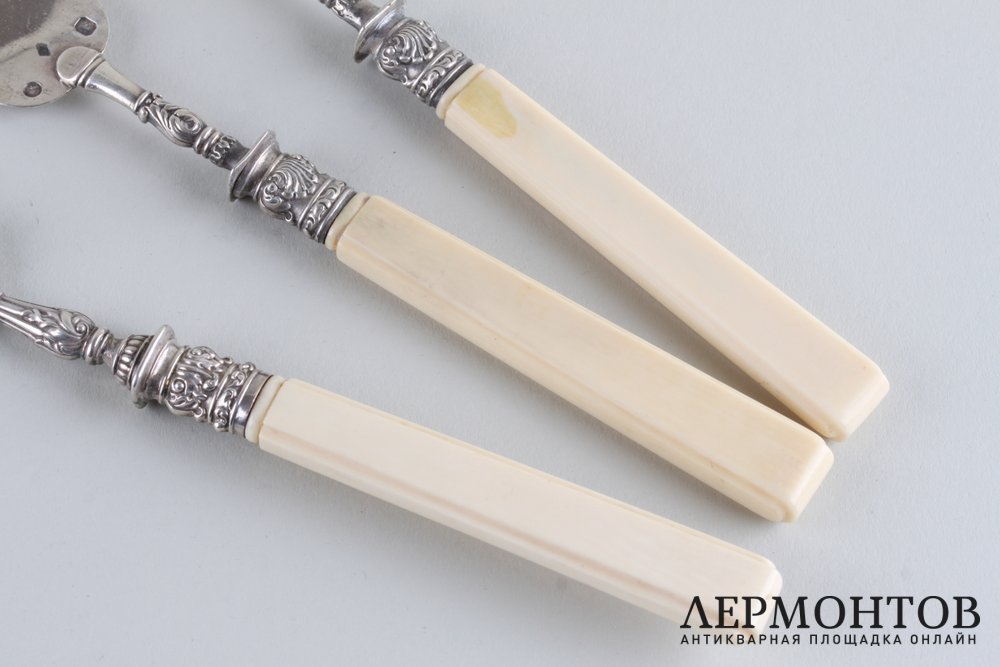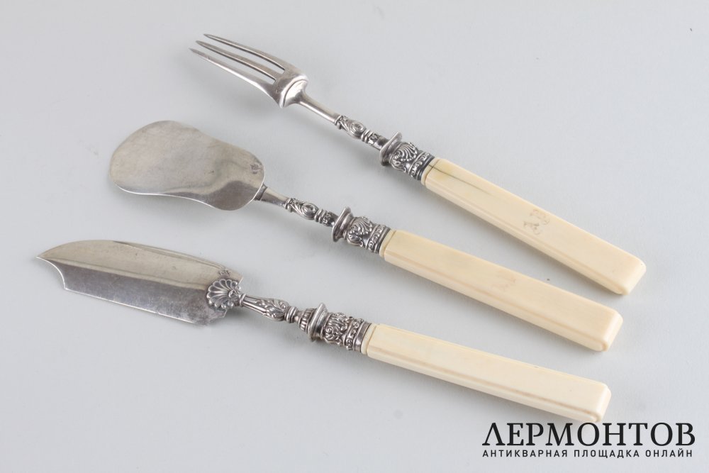 Набор для закусок из серебра 950 пробы. Изготовлен во Франции в Париже в первой половине XIX века. Выполнен в классическом стиле. Состоит из трех предметов: вилки, паштетного ножа и лопатки. Ручки изготовлены из кости. Сохранены изделия в хорошем состоянии.