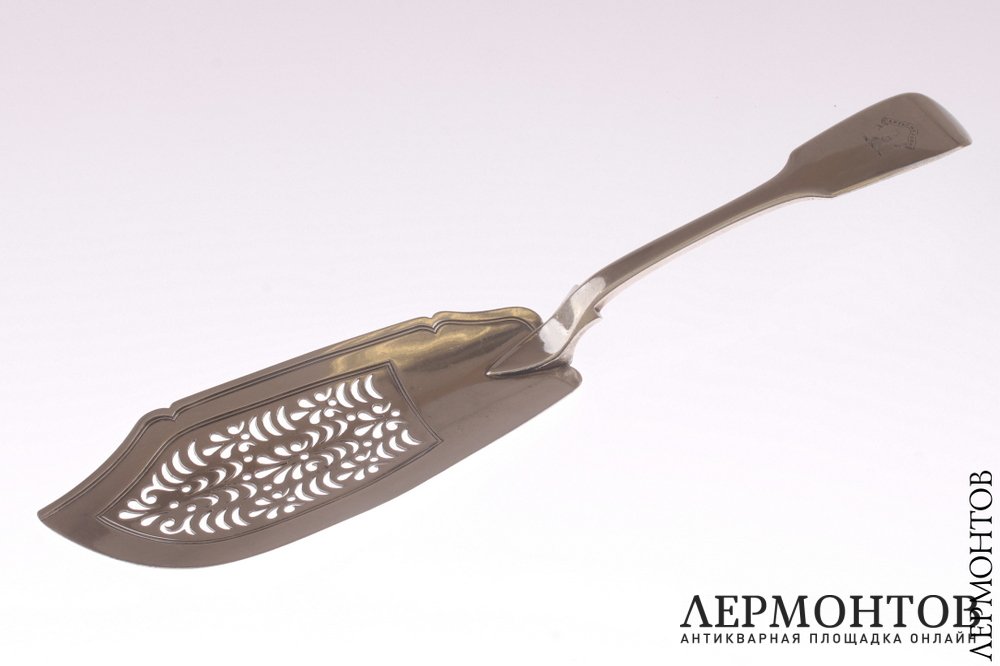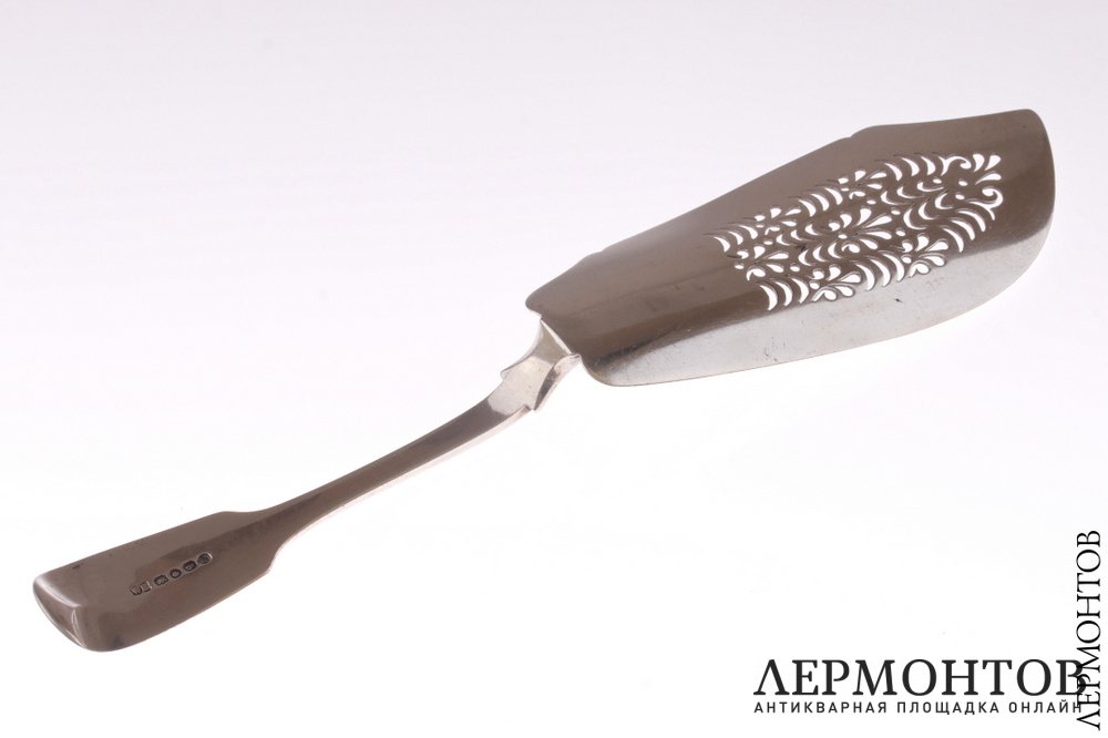 Большой рыбный нож, изготовленный из серебра 925 пробы в Англии в 1831 году. Украшен ажурным орнаментом. На ручке есть монограмма с девизом: "Capta majora". Сохранен в очень хорошем состоянии.