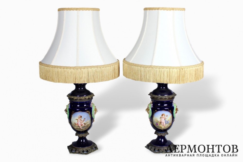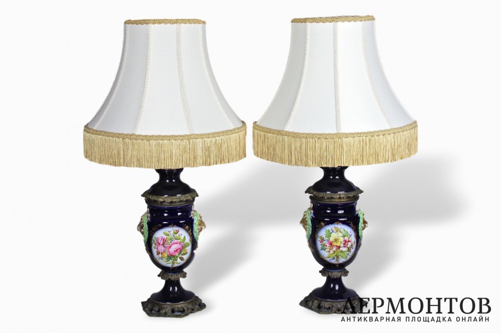 Парные фарфоровые лампы. Кобальтовый фарфор, бронза, живопись. Европа, XIXв.