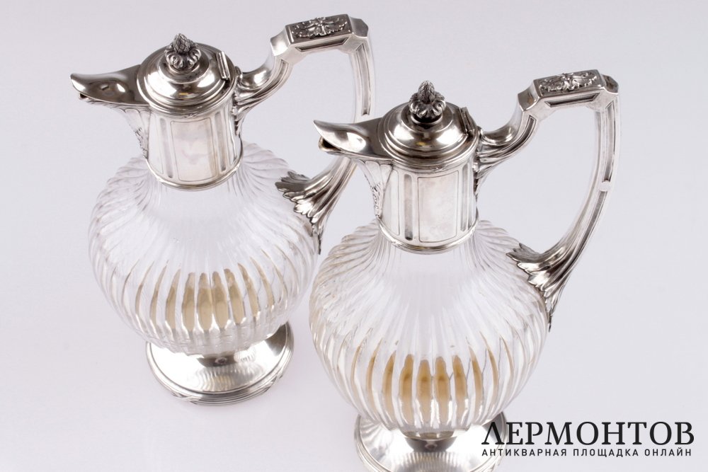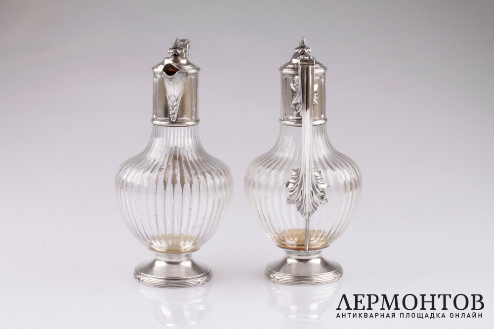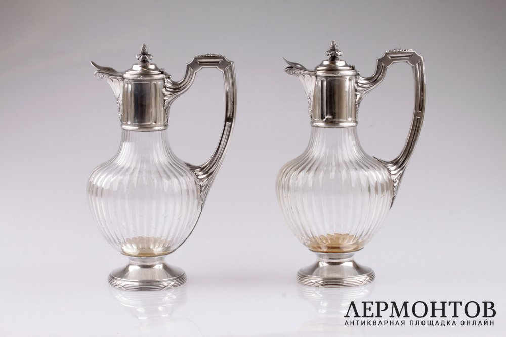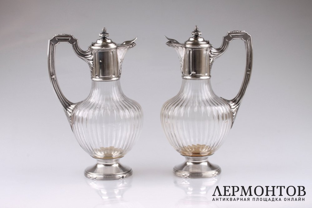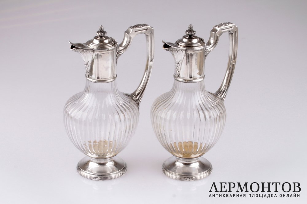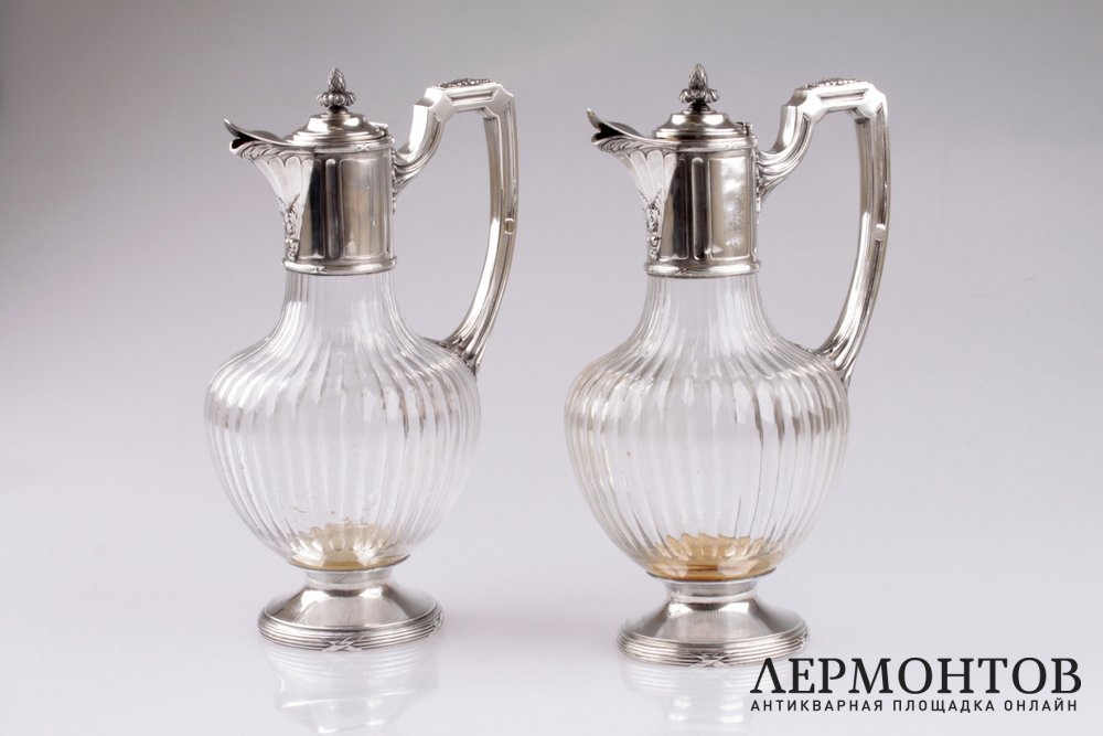 Редкая пара графинов, изготовленных из серебра 950 пробы и хрусталя в Париже в конце XIX века. Предметы выполнены в классическом стиле и украшены характерным орнаментом: лентами, листьями аканта. Сохранены в отличном состоянии.
