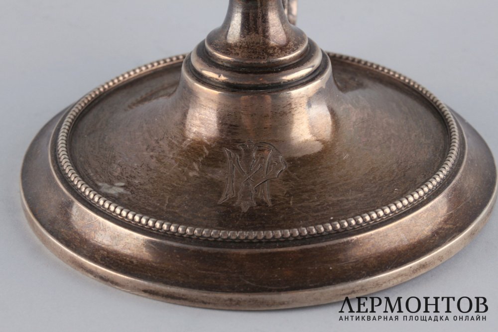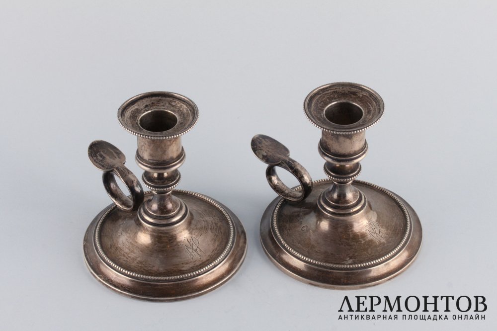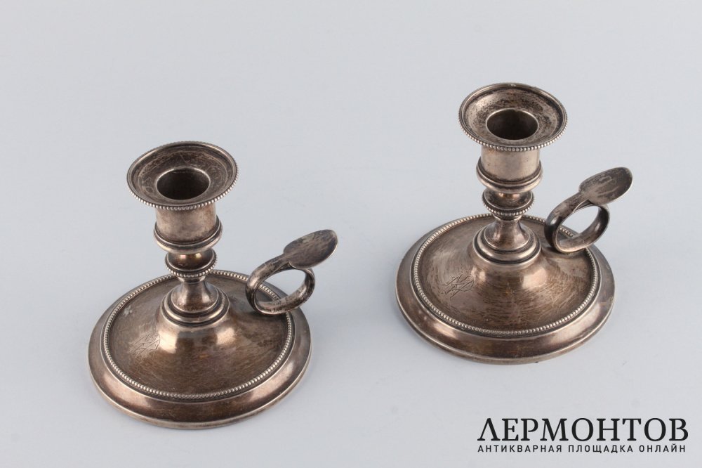 Парные подсвечники из серебра 84 пробы, изготовленные в мастерской Игнатия Павловича Сазикова в Санкт-Петербурге в 1873 году. Выполнены в классическом стиле.