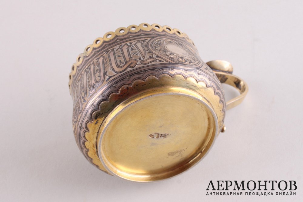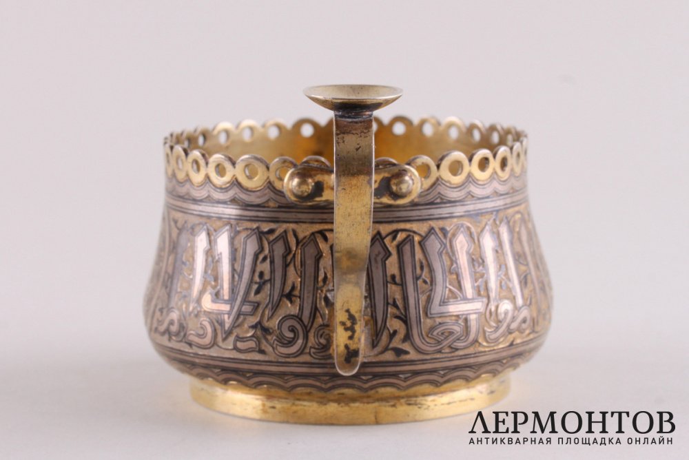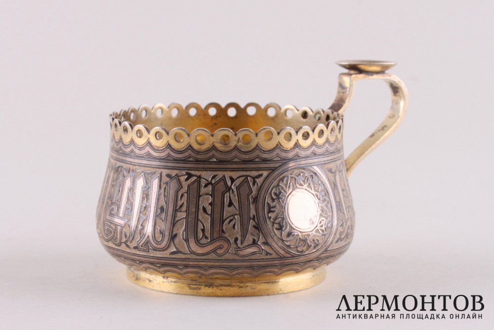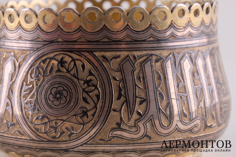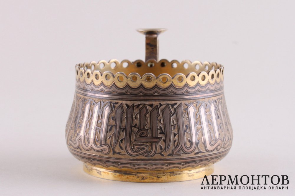 Антикварный подстаканник, изготовленный из серебра 84 пробы в Москве в 1870 году. Украшен черневым узором и надписью на арабском языке по всему периметру.
