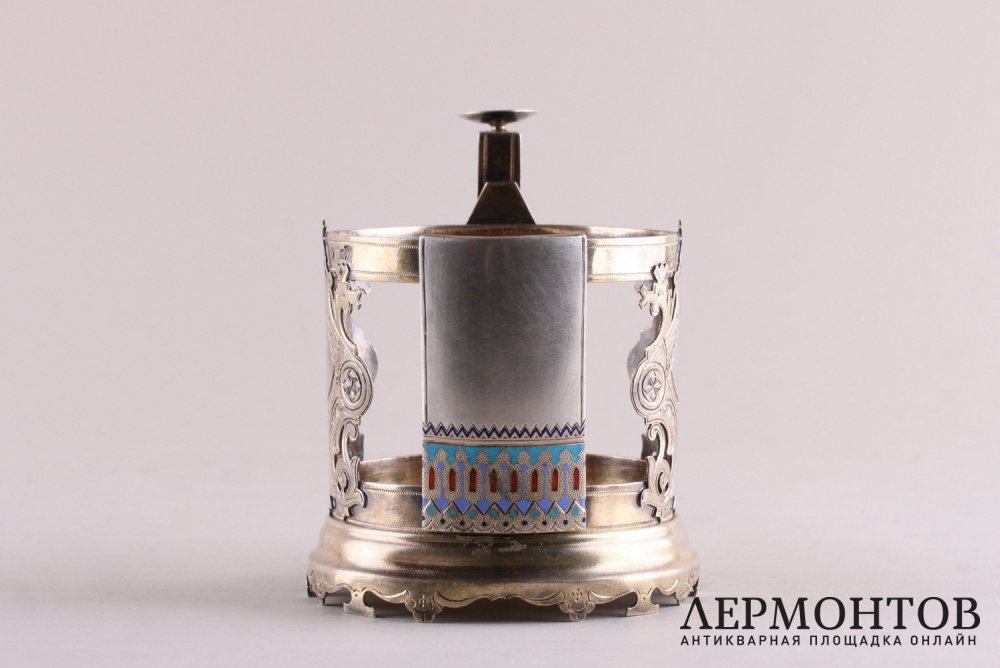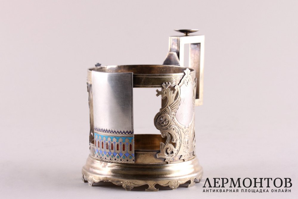 Редкий антикварный подстаканник из серебра 84 пробы, изготовленный в Российской империи в Москве в 1888 году. Изделие выполнено в русском стиле, украшено полихромной выемчатой эмалью и покрыто золочением.