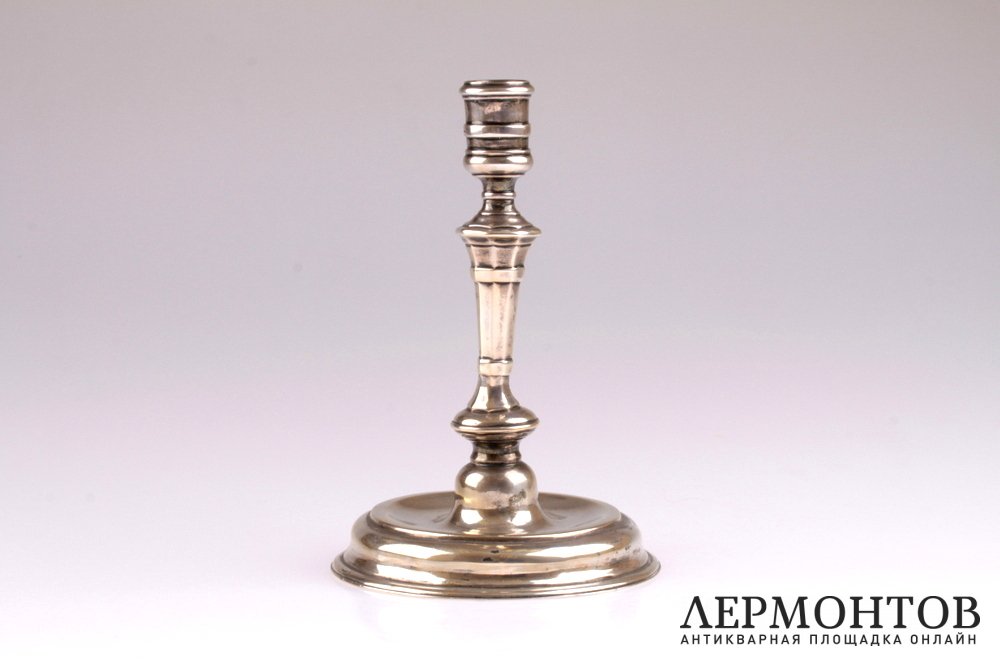 Подсвечник, изготовленный из серебра 812 пробы (13 лот) в 1763 году в Австрии. Предмет выполнен в классическом стиле, сохранен в хорошем состоянии, есть следы реставраций.