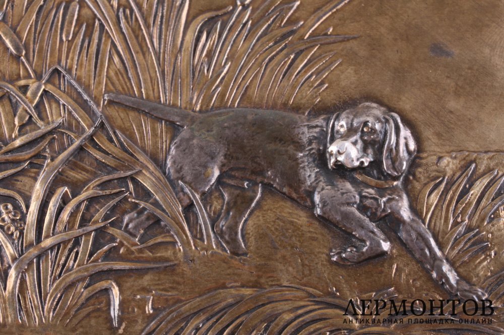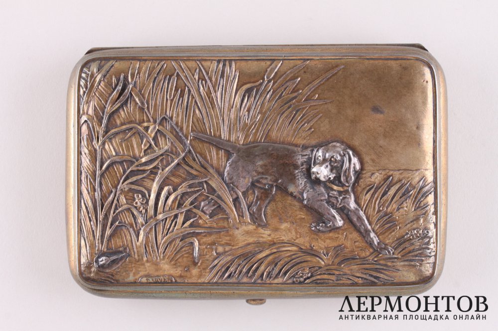 Редкий большой портсигар из серебра 84 пробы, изготовленный в мастерской Веннерстрема Олофа Фредерика в Санкт-Петербурге в 1830-е годы. Украшен рельефной накладкой с изображением сцены охоты на мотив известного французского скульптора-анималиста Антуана-Луи Бари.