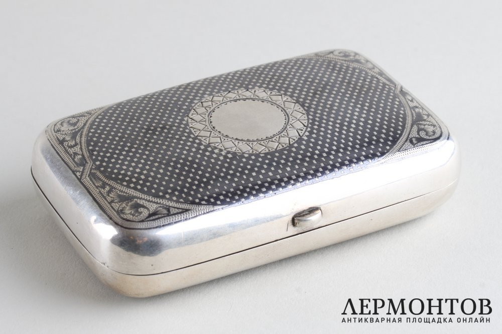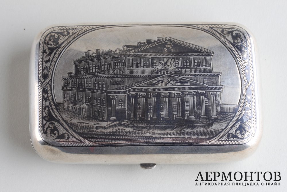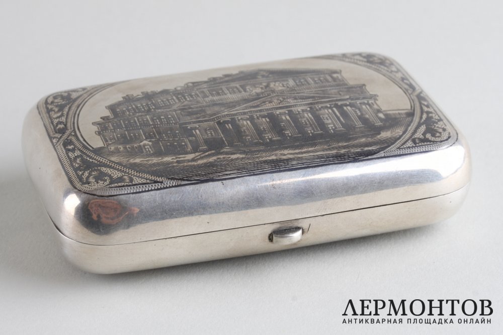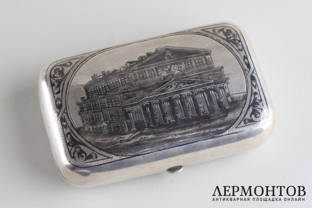 Редкий портсигар из серебра 84 пробы, изготовленный в мастерской Анны Акимовны Столяровой (Иванов 4009) в Москве в последней четверти XIX века. Украшен черневым узором с изображением Большого театра. Сохранен в отличном состоянии. Представляет исторический и коллекционный интерес.