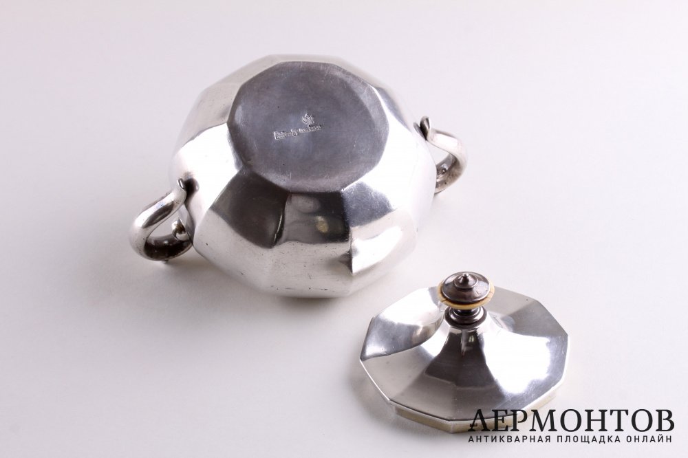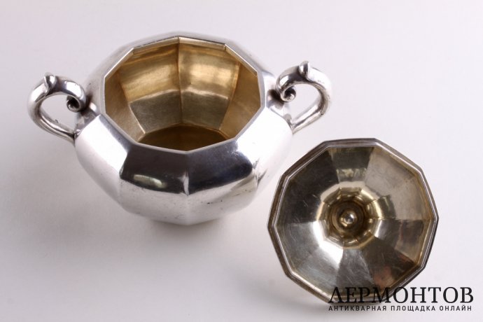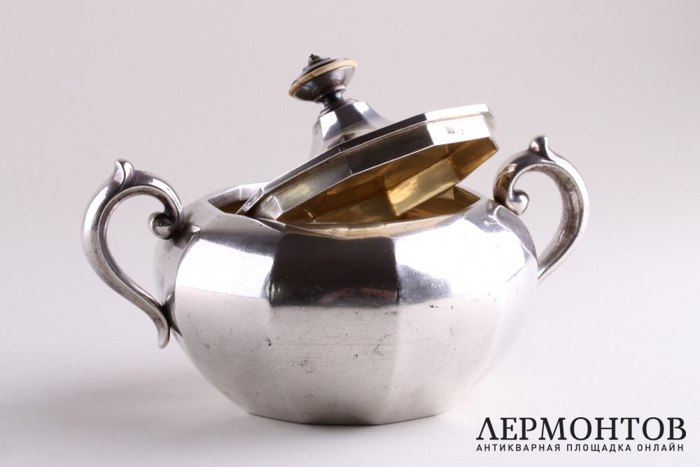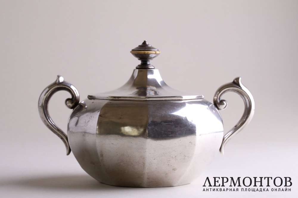 Сахарница из серебра 84 пробы, изготовленная в мастерской Игнатия Павловича Сазикова в Москве в 1856 году. Выполнена в классическом стиле. Внутри сахарницы золочение.
